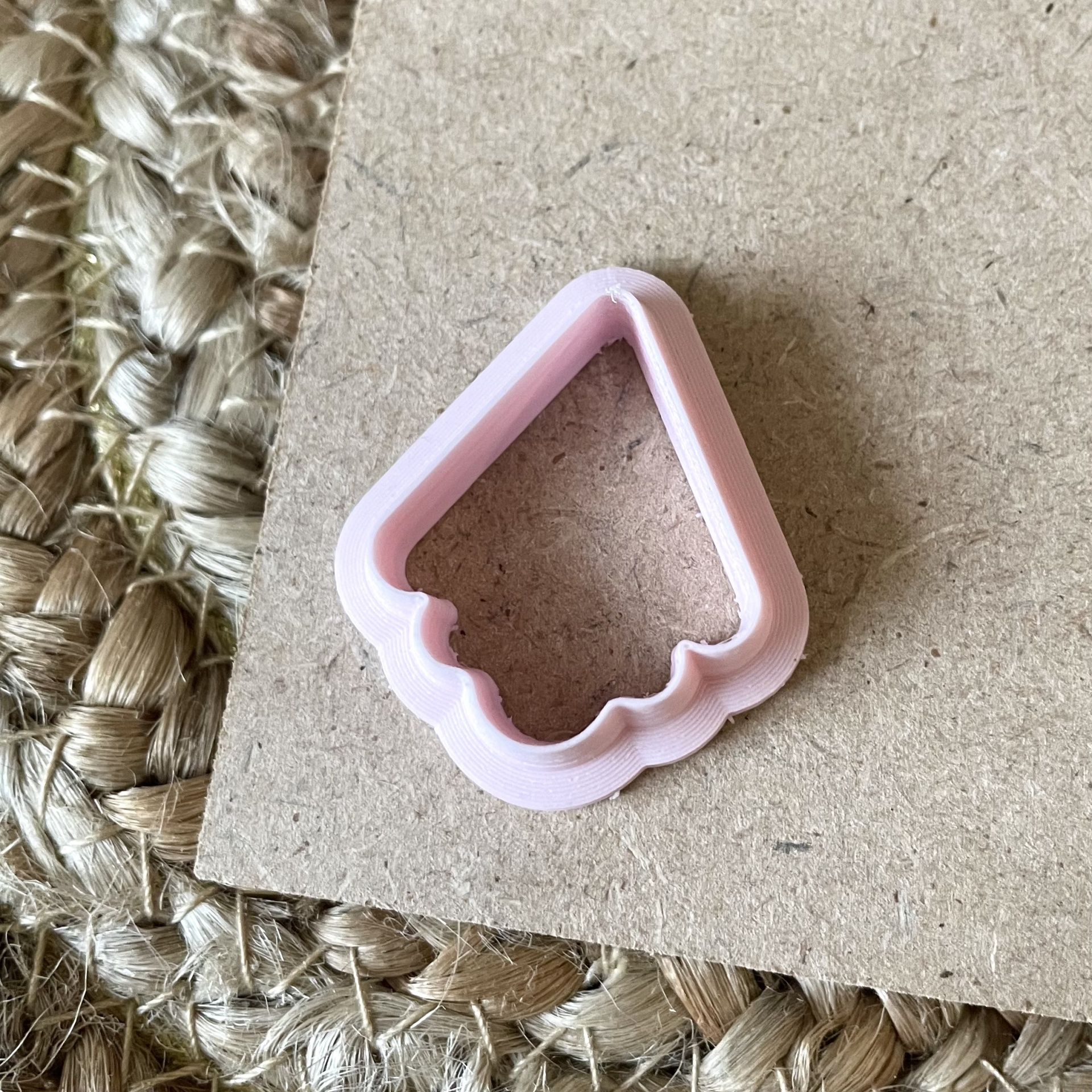 • cortador rosa em forma de flecha com massa castanha moldada, sobre madeira clara e tapete entrelaçado