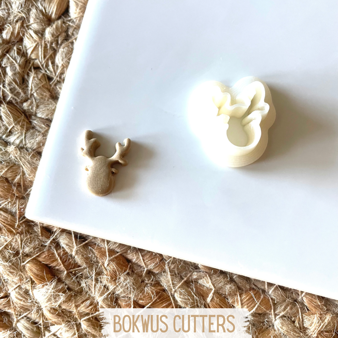 • Cortador de bolachas branco em forma de cabeça de rena sobre bandeja cinzenta com etiqueta BOKWUS CUTTERS