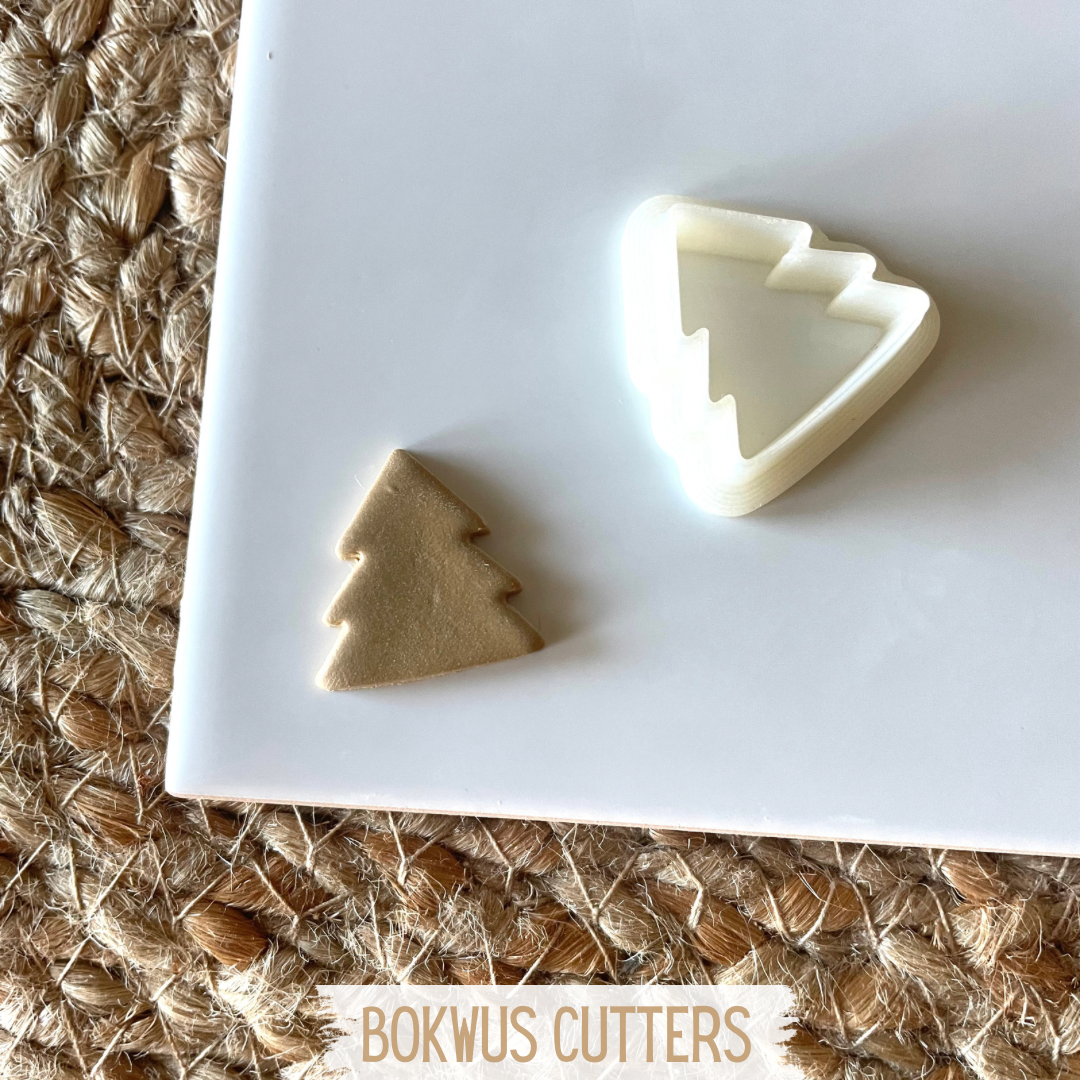 • Cortador de árvore de Natal branco com massa dourada cortada e texto BOKWUS CUTTERS