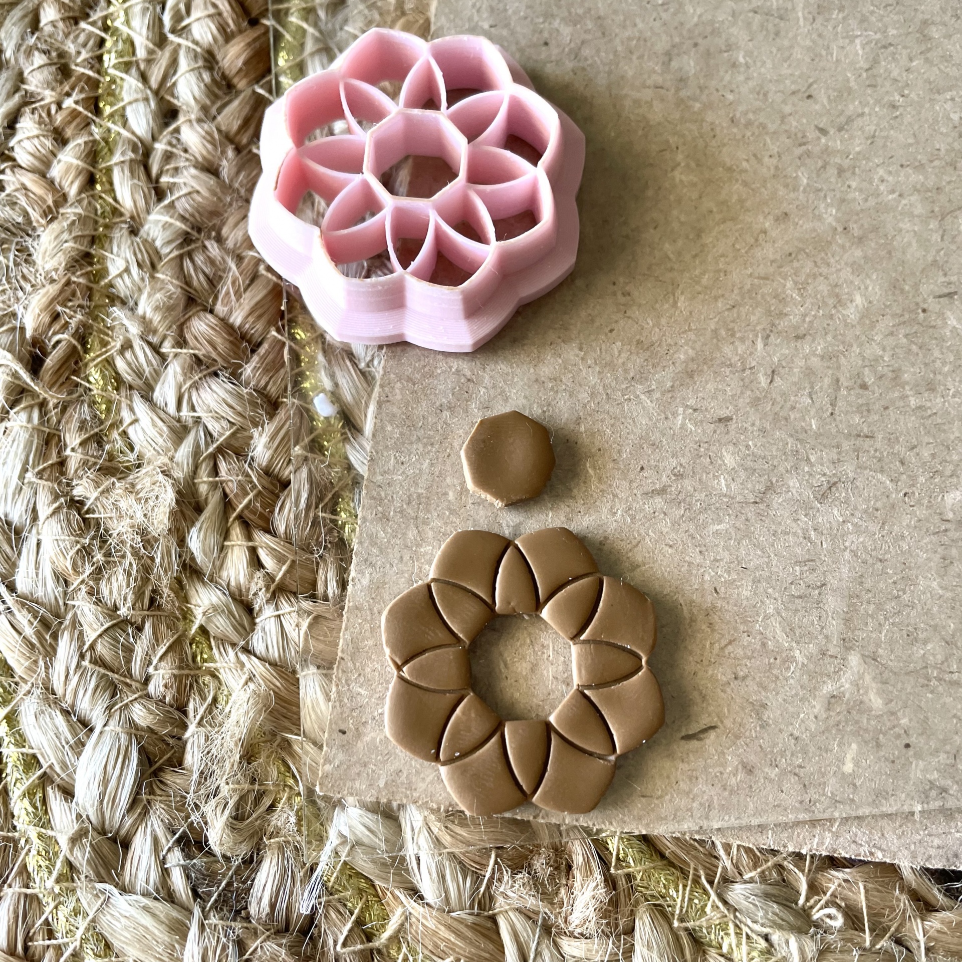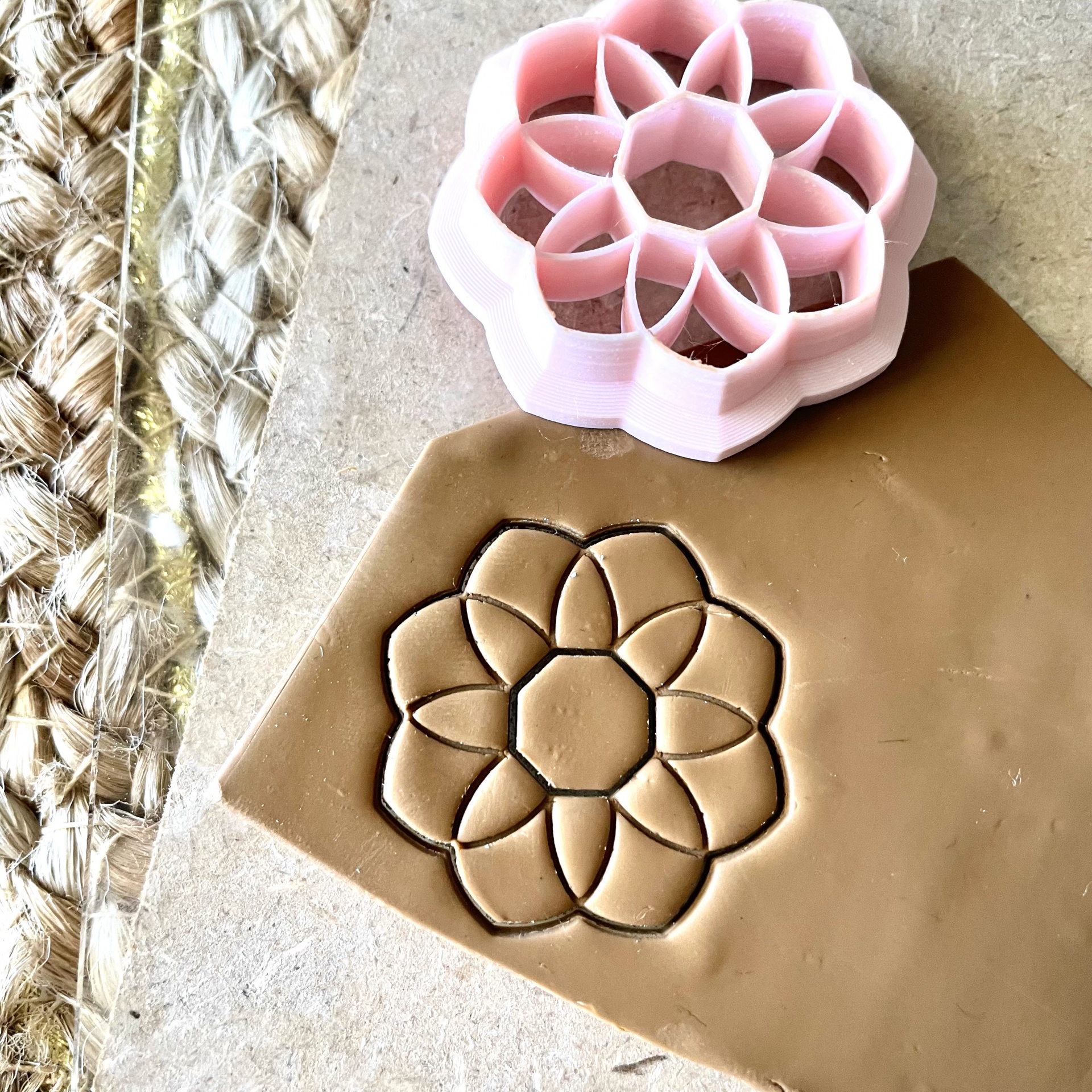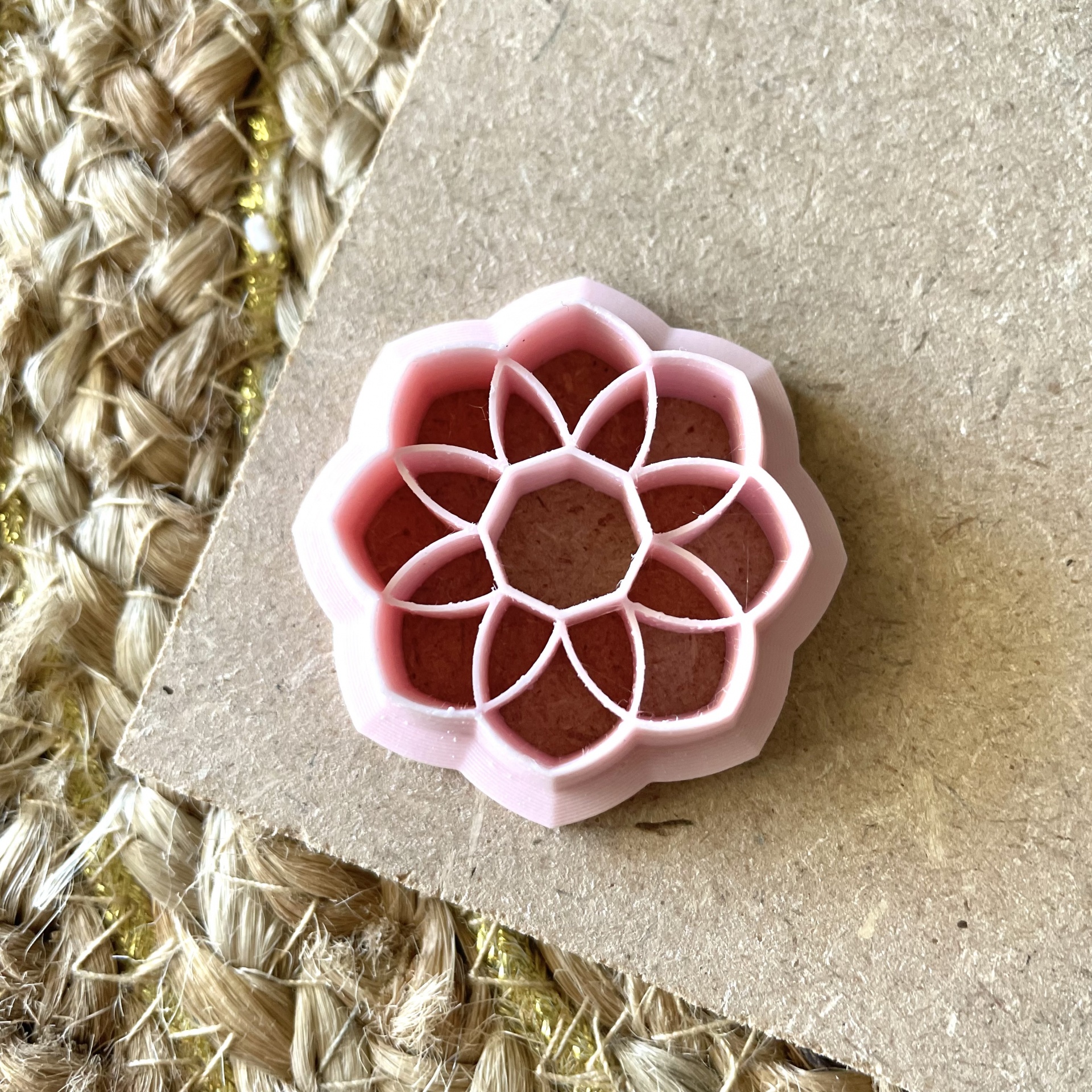 • Cortador de massa ou biscoitos rosa com formato floral geométrico sobre cartão castanho