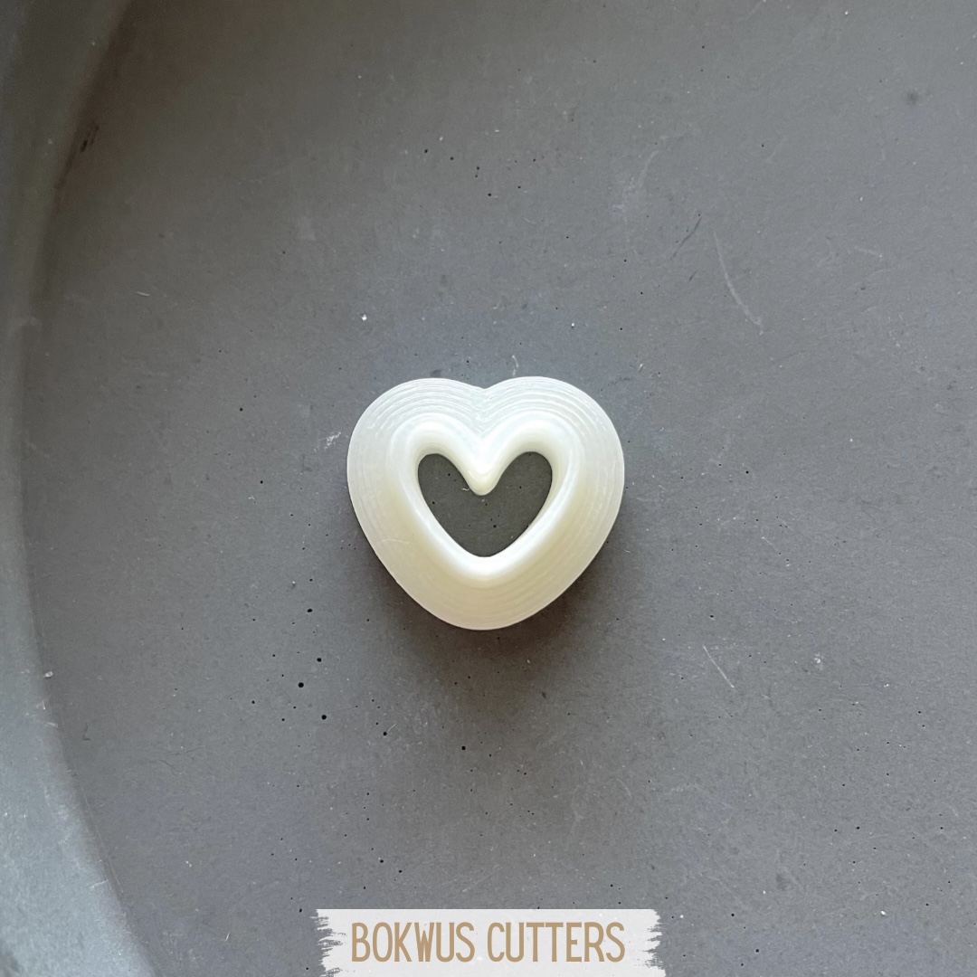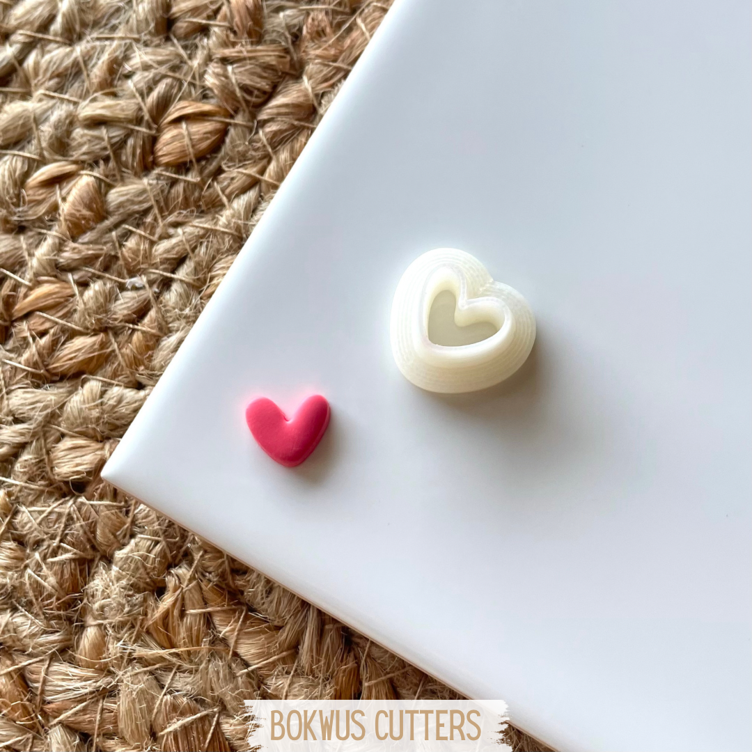 Forma de corte em plástico branco em forma de coração numa superfície cinzenta com texto BOKWUS CUTTERS