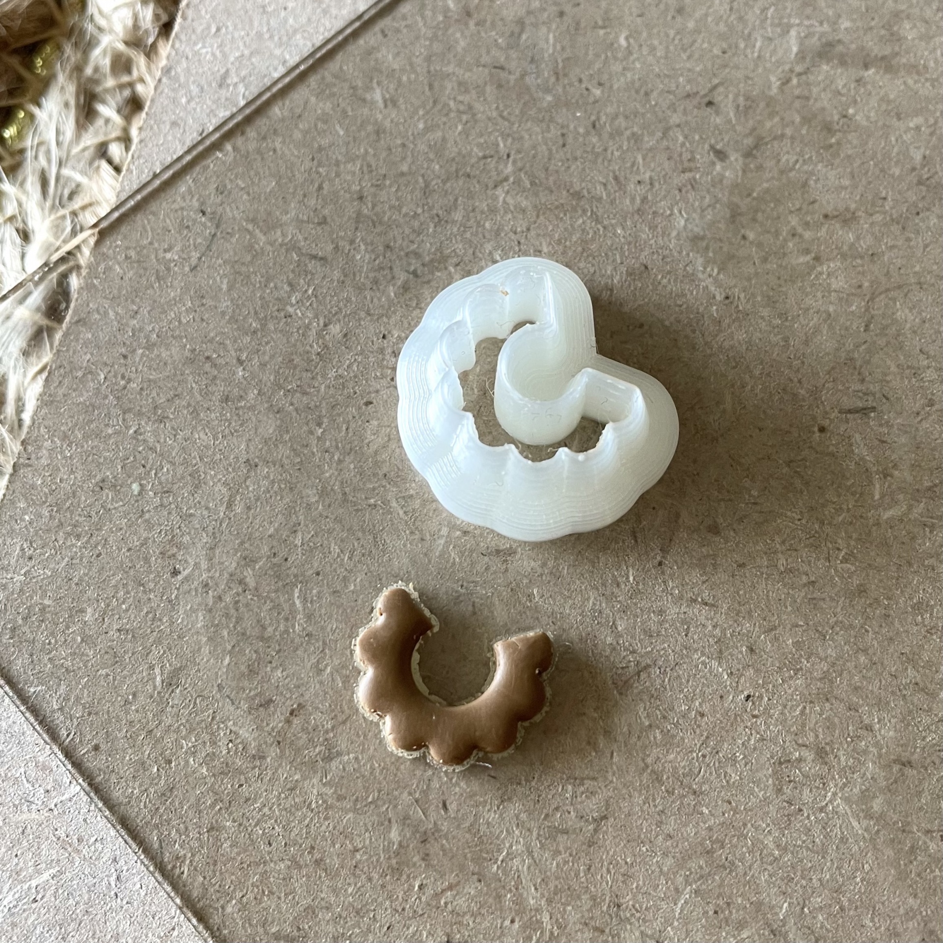 • Dois objetos ondulados em forma de meia-lua, um branco translúcido e outro castanho, sobre fundo cinza texturizado.