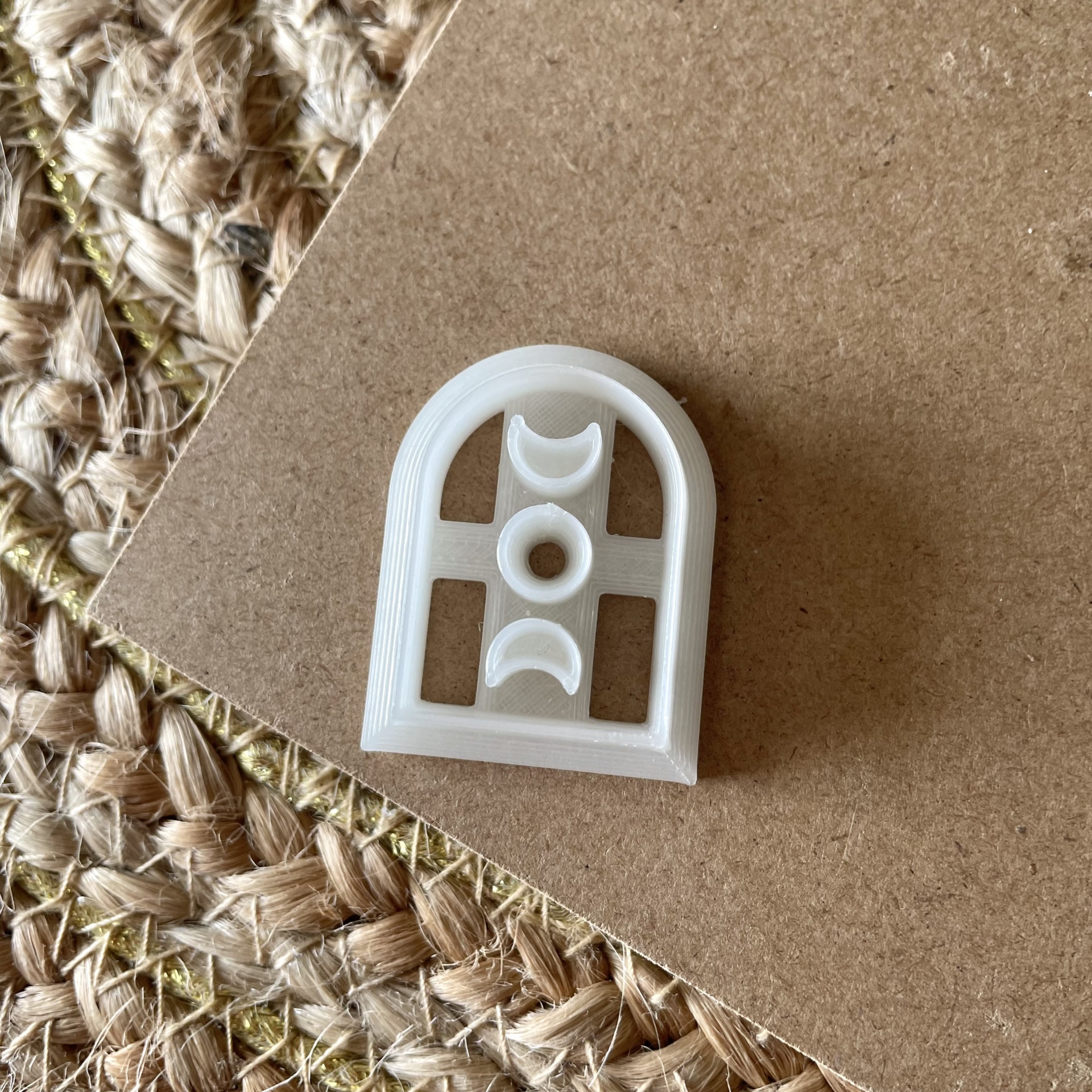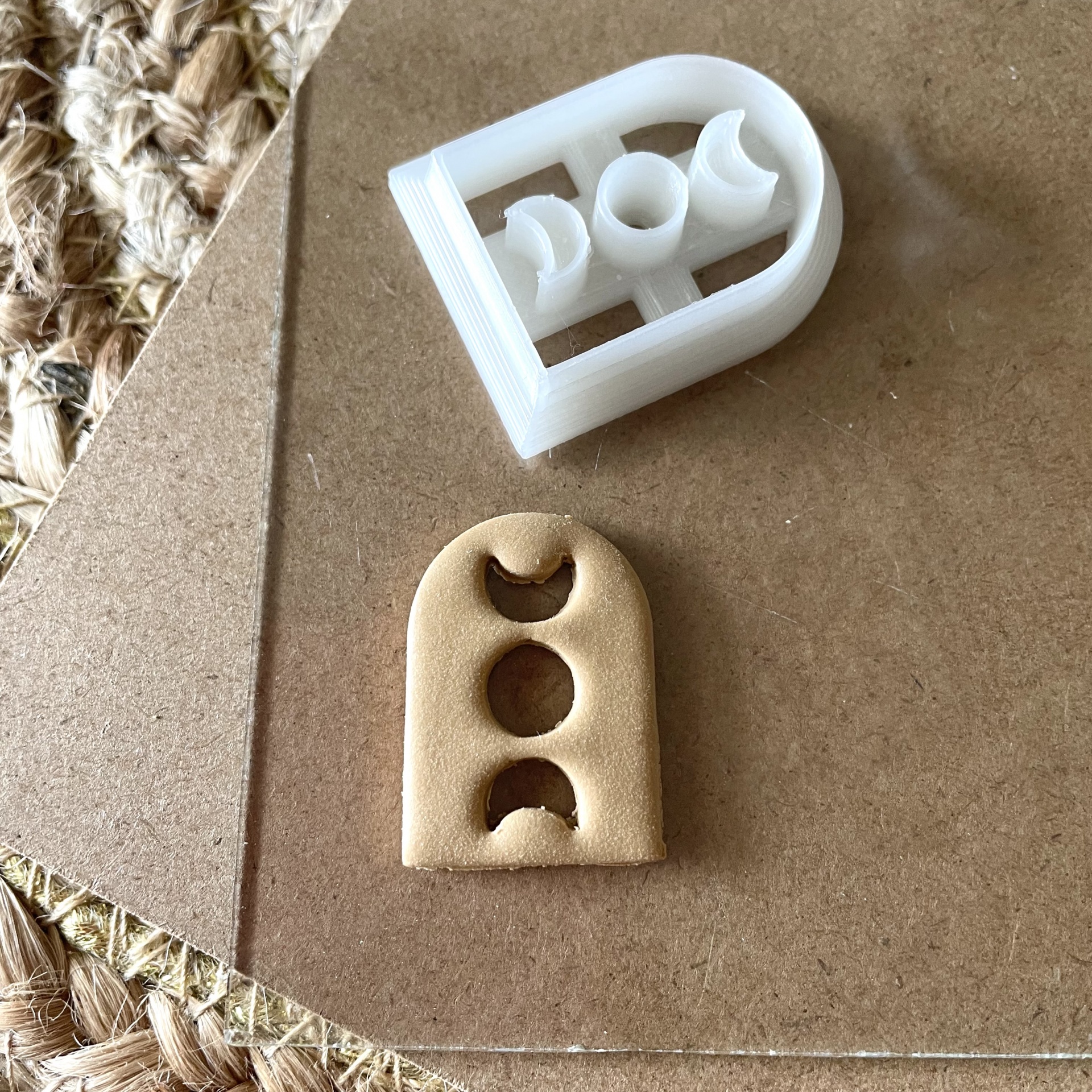 • Molde branco de plástico e peça moldada bege com formas de luas sobre madeira
