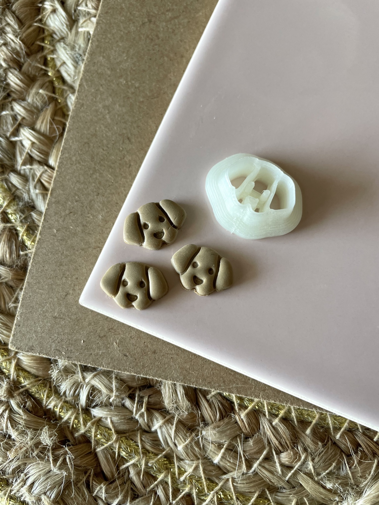Botões em forma de cabeça de cão com cortador branco sobre papel rosa e tapete texturado