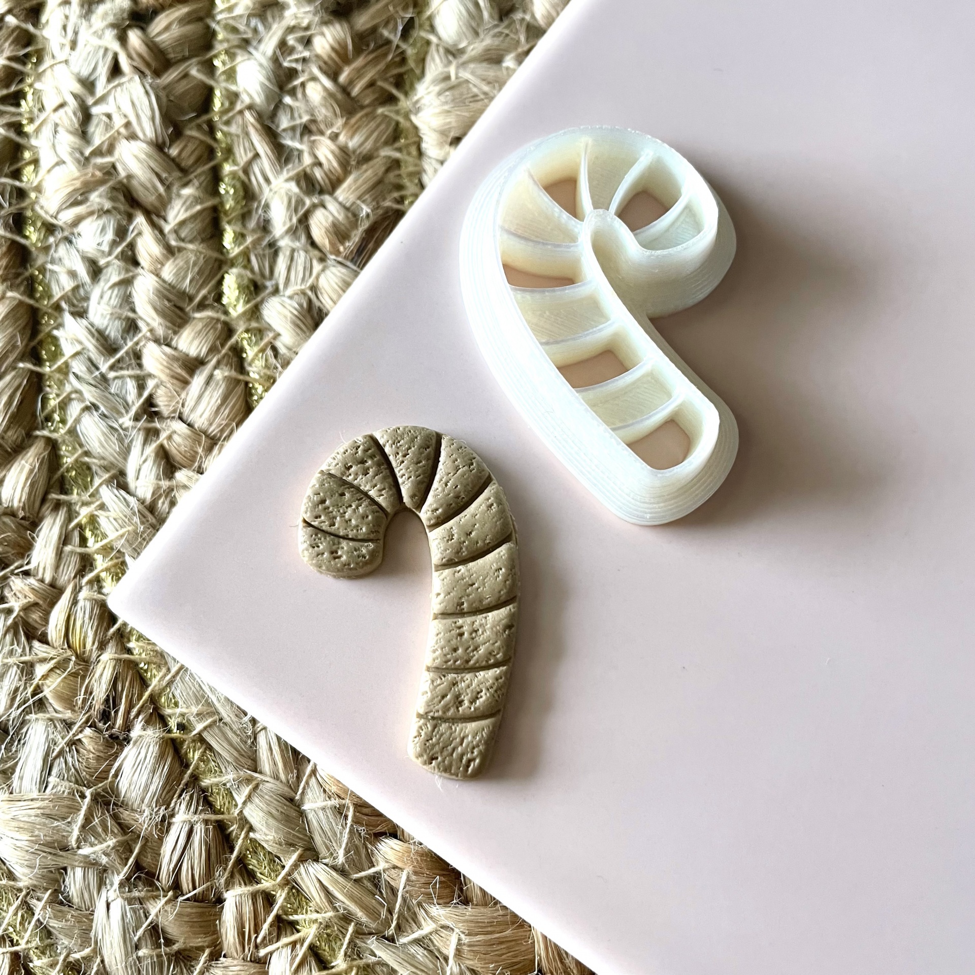 Dois objetos em forma de bengala de Natal, um branco e outro bege, sobre superfície rosa e tapete de fibras naturais