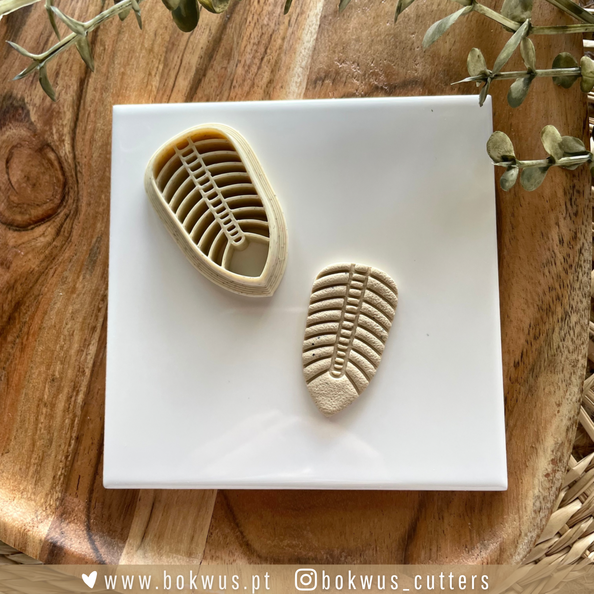• Cortador de plástico para bolachas em forma de folha com textura, colocado sobre azulejo branco em tabuleiro de madeira