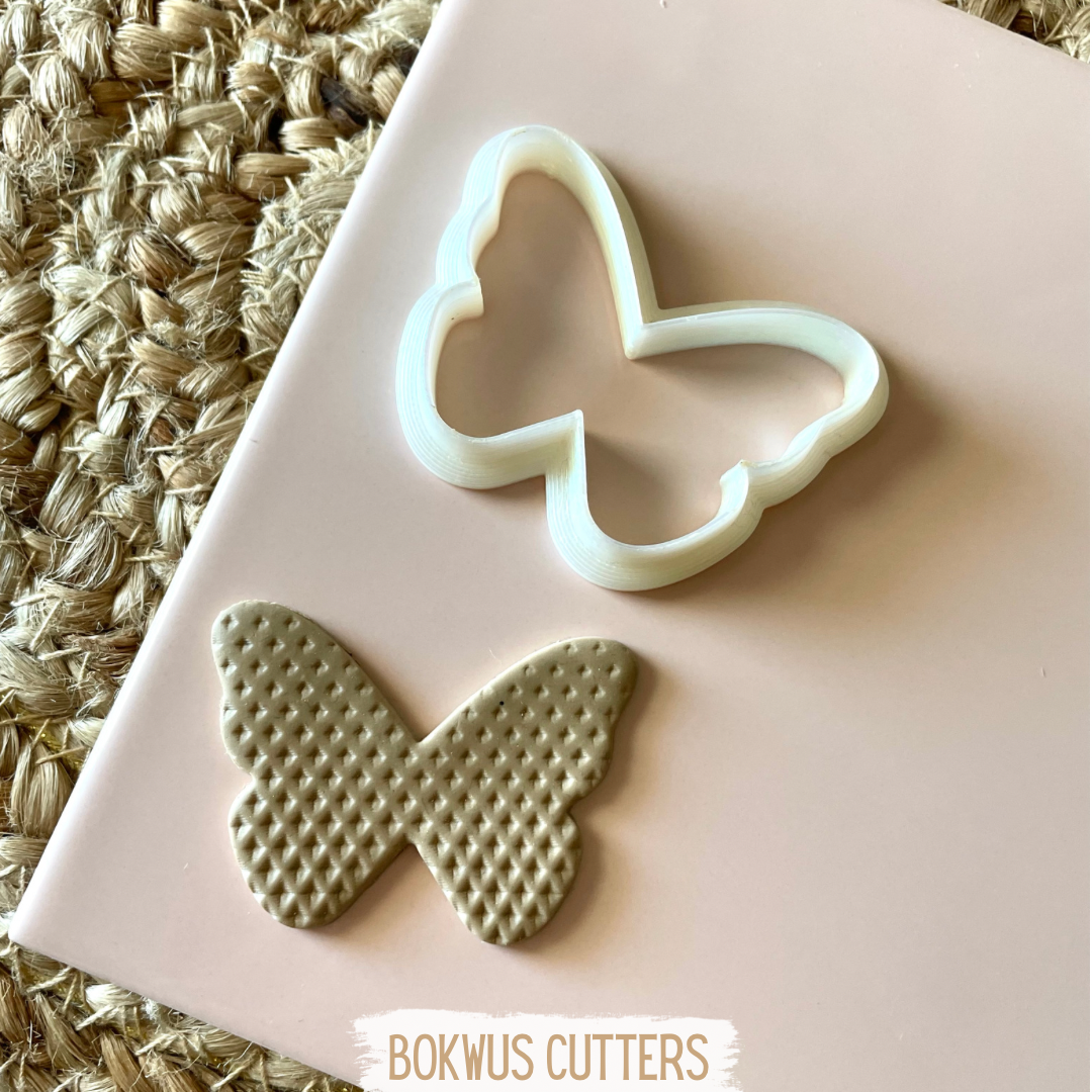 Cortante de borboleta branco sobre prato escuro com etiqueta BOKWUS CUTTERS