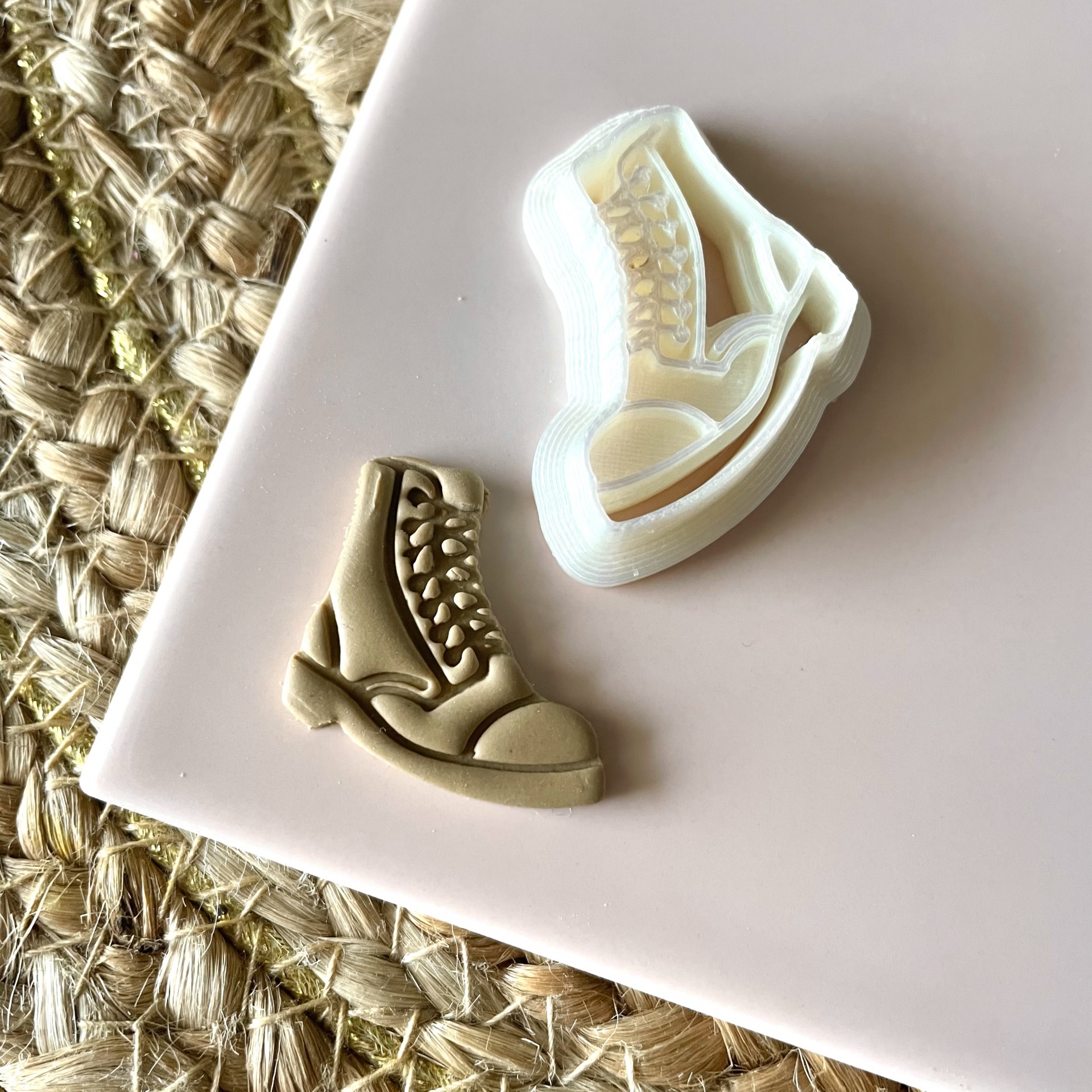 • Dois moldes de silicone para sabonetes em forma de bota, um branco e um bege, sobre superfície rosa e tapete têxtil