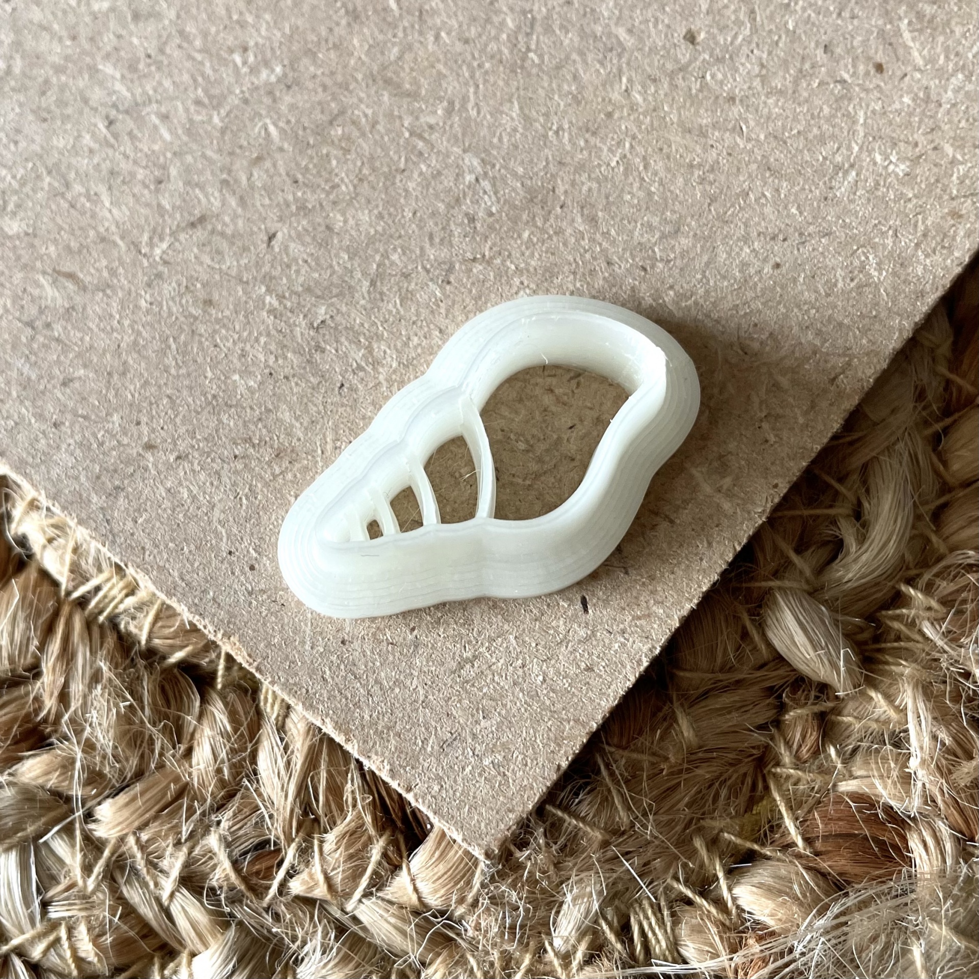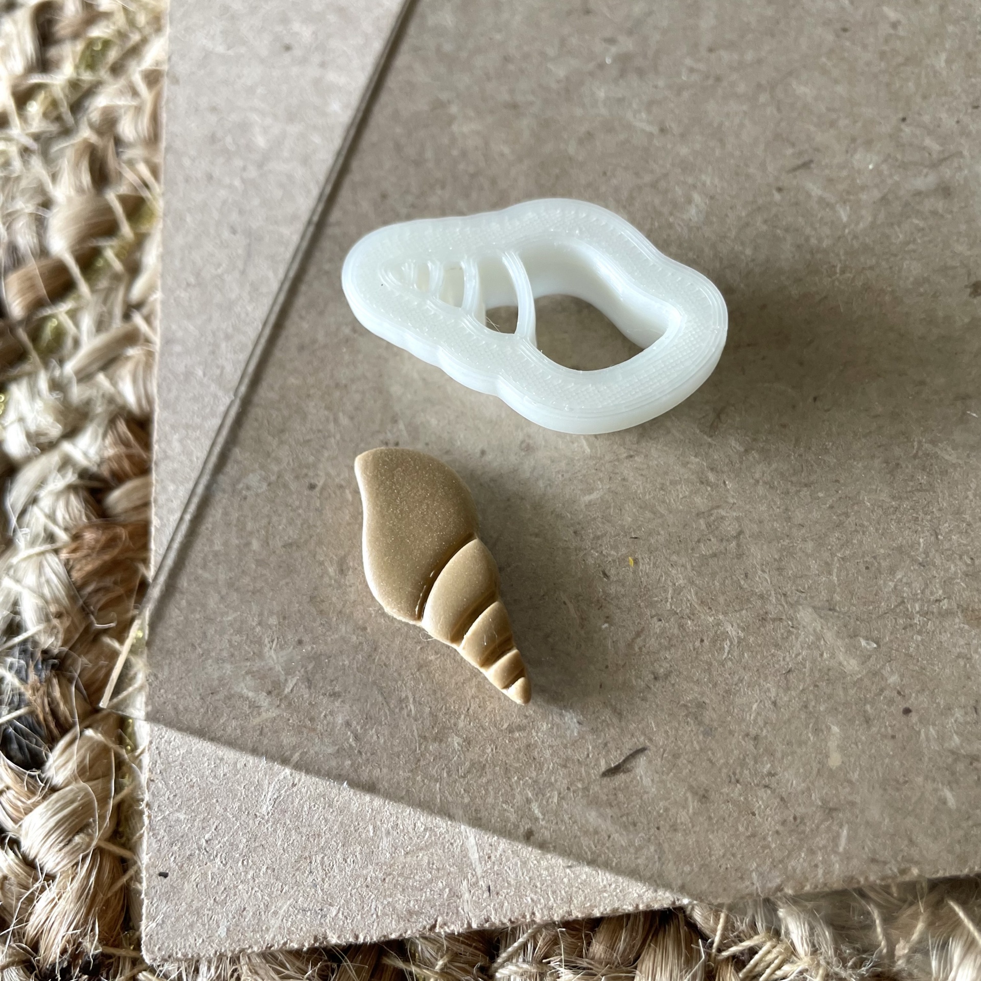 • Objeto branco em forma de concha sobre cartão castanho e tapete de fibra trançada