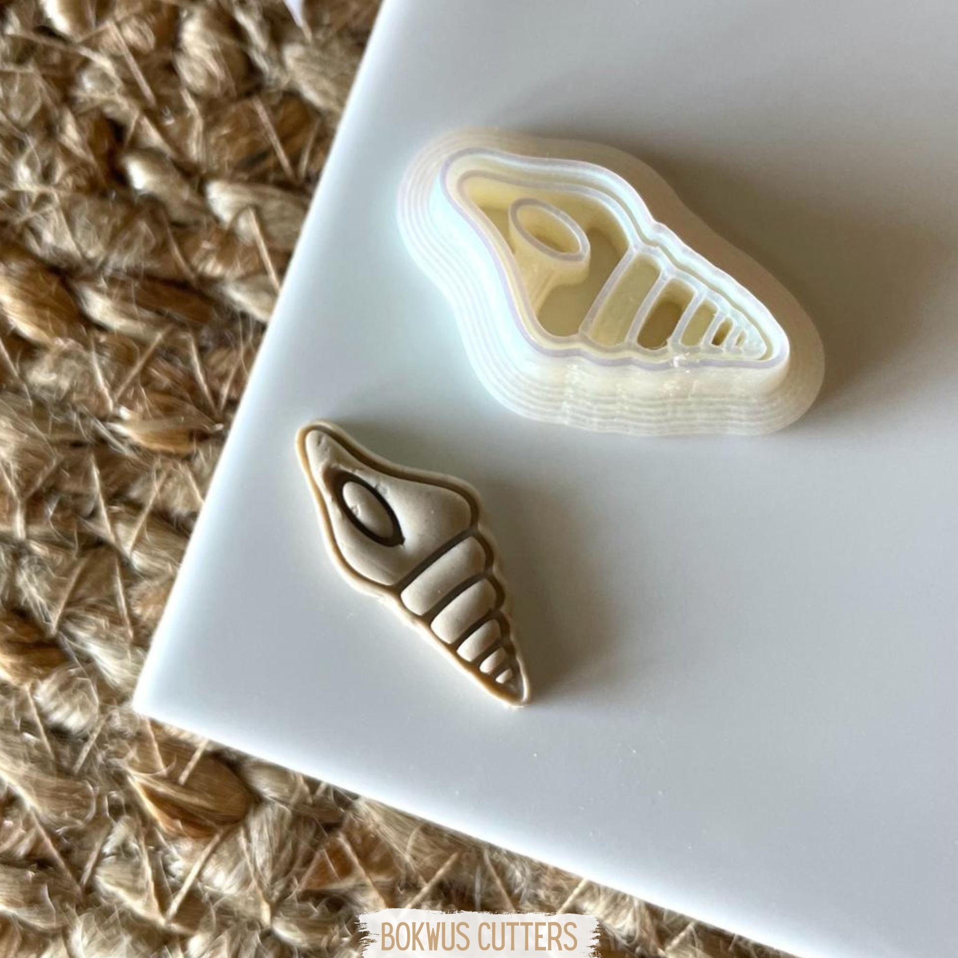 • Cortante de biscoitos em forma de concha com biscoito decorado em prato branco