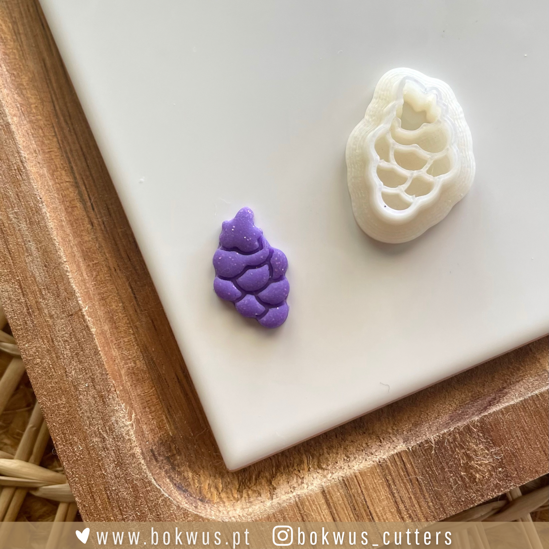 Cortador branco de plástico e peça roxa em forma de cacho de uvas sobre bandeja de madeira