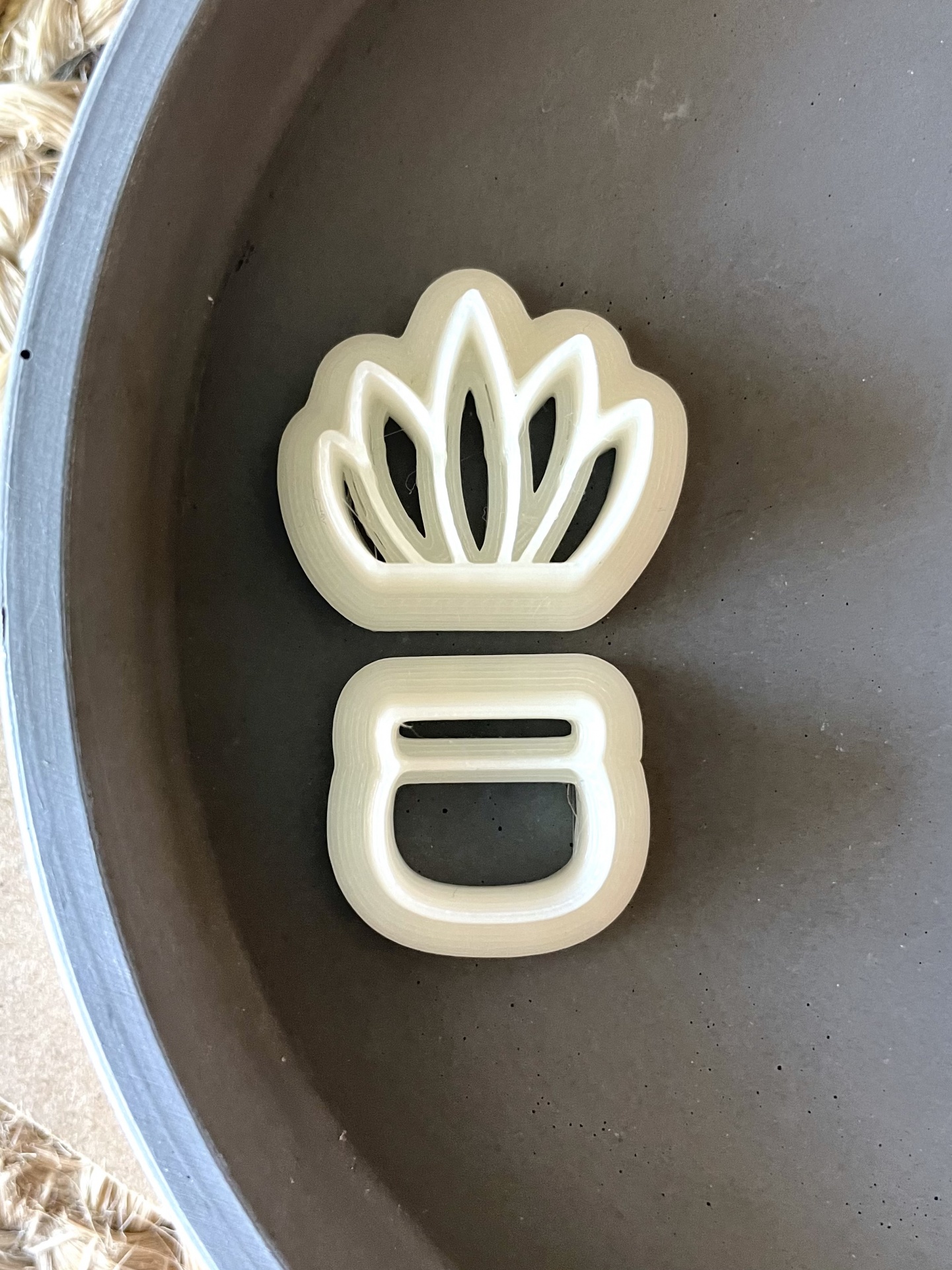 • Dois cortadores de biscoitos brancos em forma de planta sobre superfície cinza