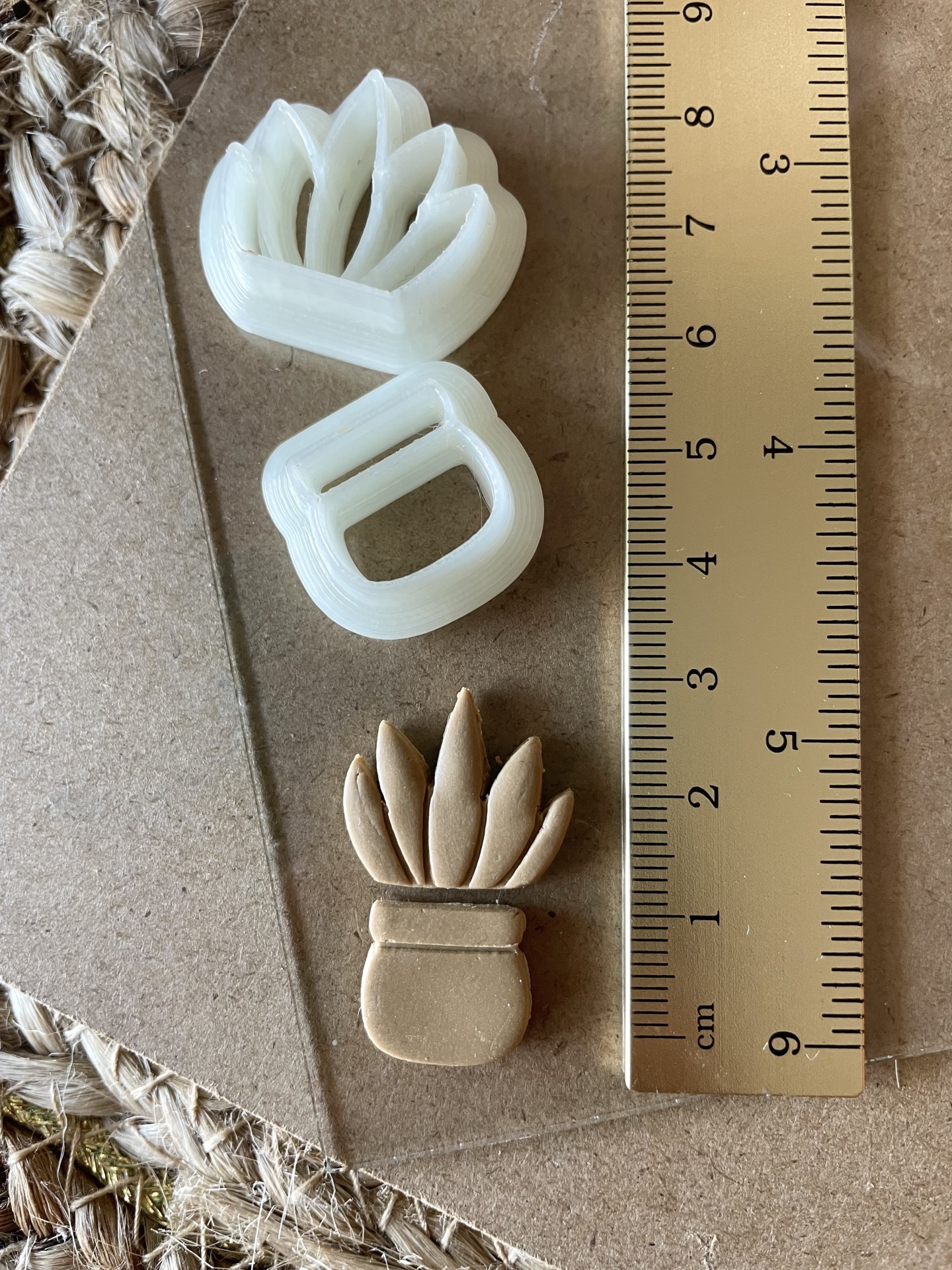 • Dois cortadores de massa em forma de vaso com folhas junto a uma régua de 10 cm sobre madeira e tecido rústico
