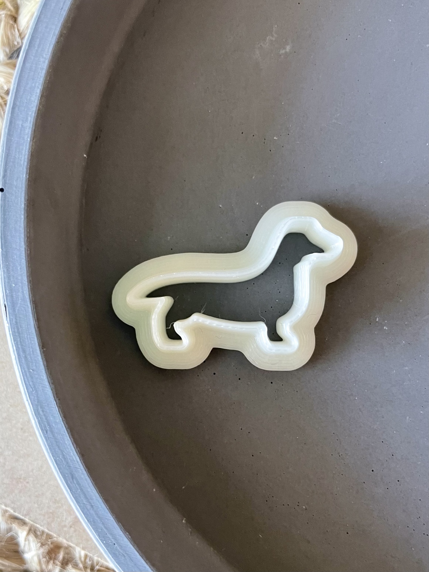 • Cortador de bolachas branco e bolacha castanha em forma de cão dachshund sobre cartão e tapete de fibras naturais