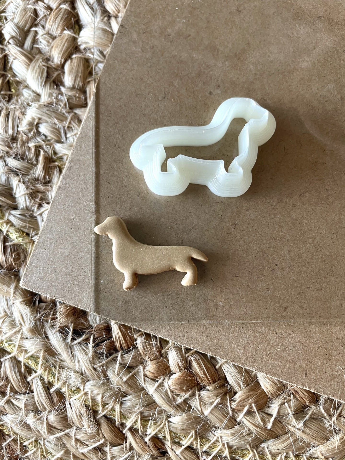 Cortador de bolachas branco e bolacha castanha em forma de cão dachshund sobre cartão e tapete de fibras naturais