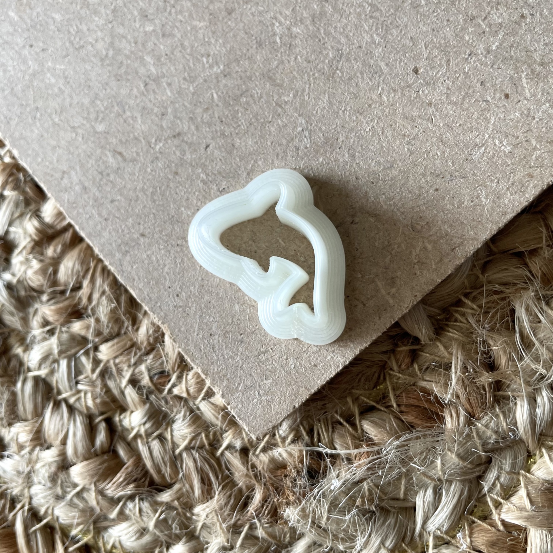 • Cortador de massa branco em forma de golfinho com peça de massa bege cortada numa superfície castanha.