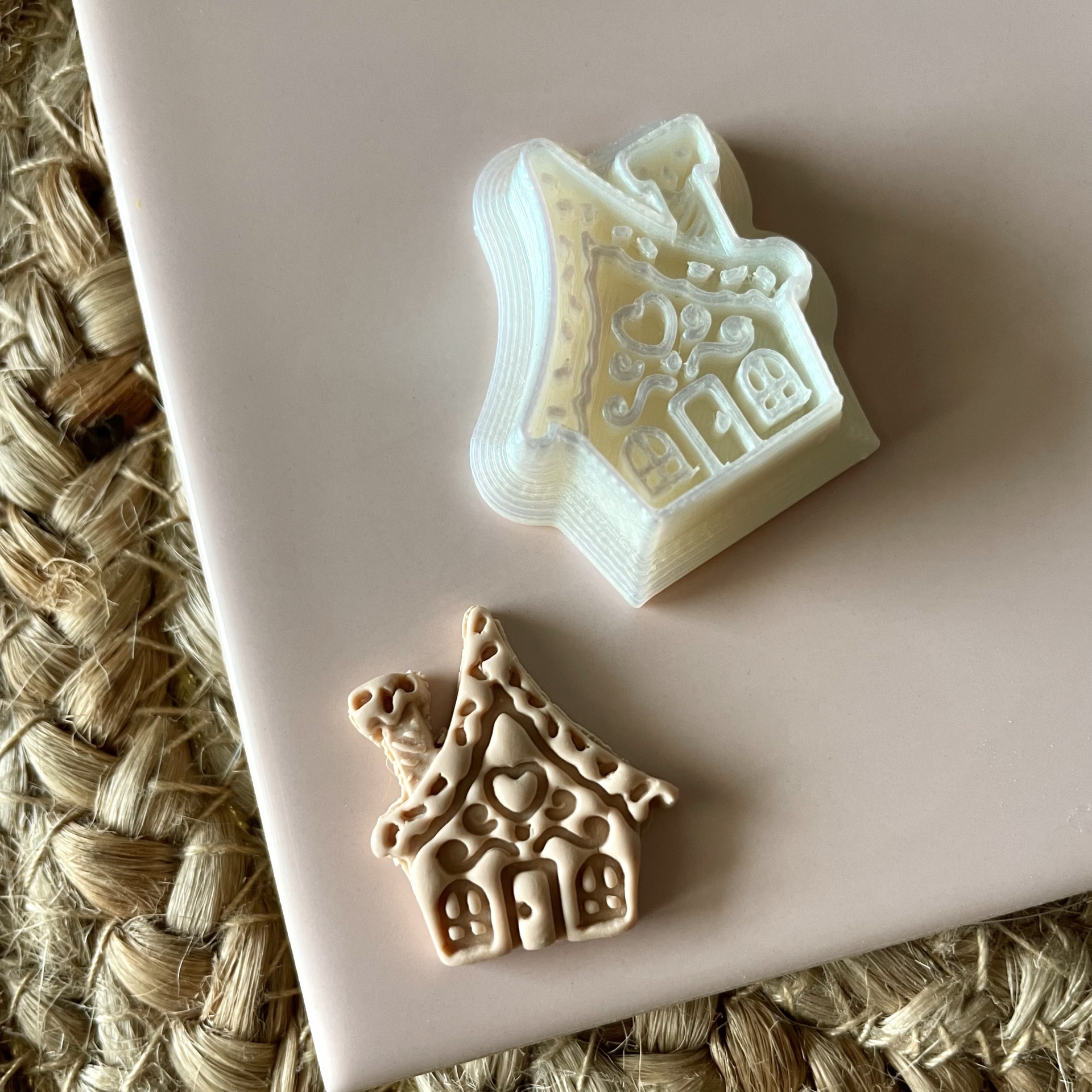 • Carimbo de casa branco e selo de barro marrom claro sobre superfície rosa com tapete de fibras ao lado