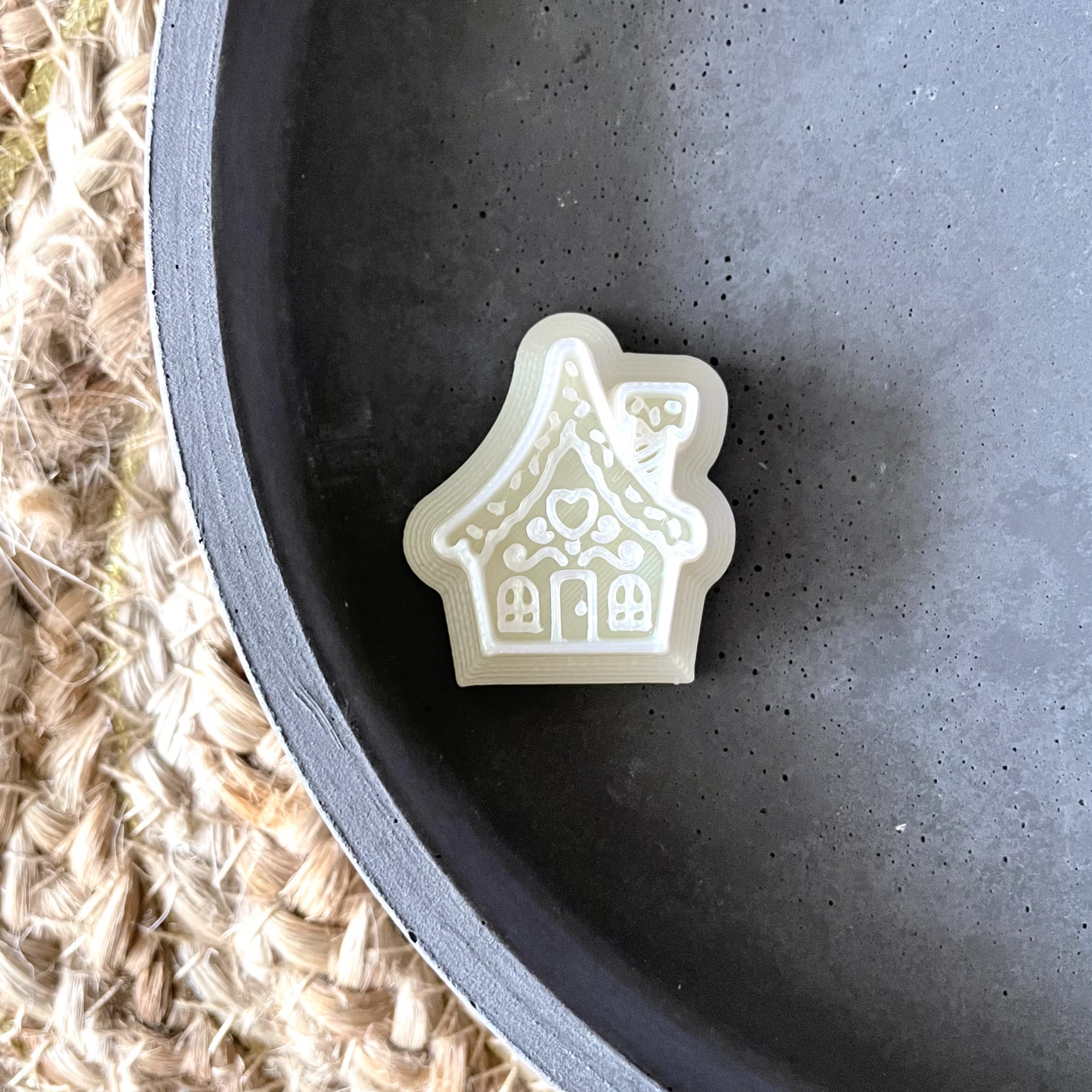 Figura adesiva de casinha creme com desenhos brancos sobre prato preto rugoso