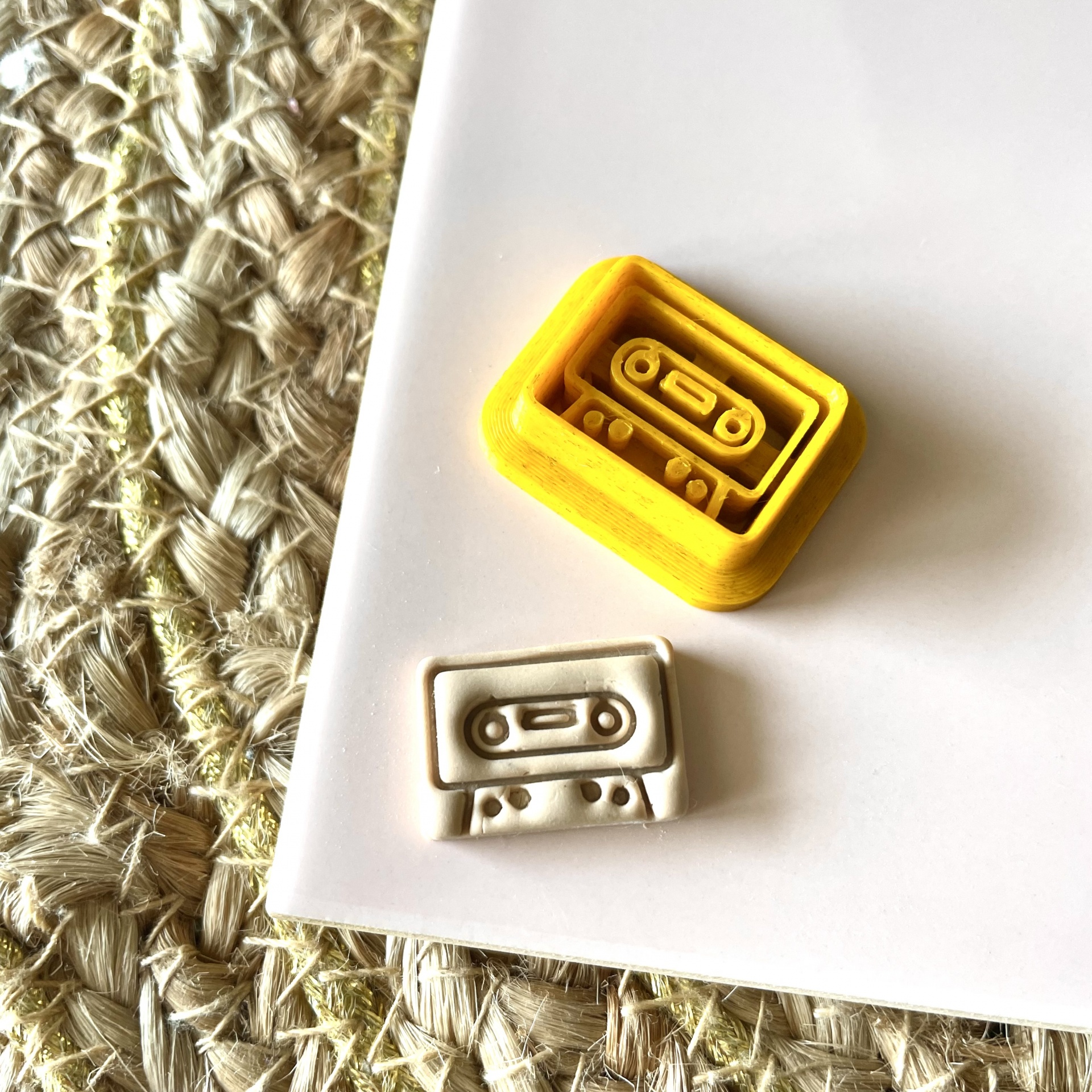 • dois objetos pequenos em forma de cassete, amarelo e branco, sobre superfície branca junto a tapete de fibras naturais