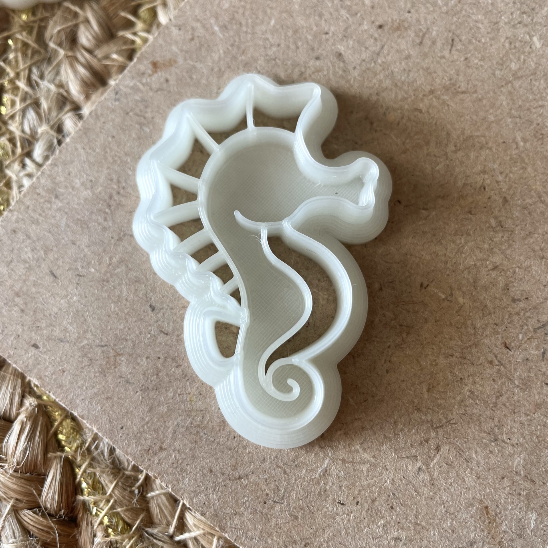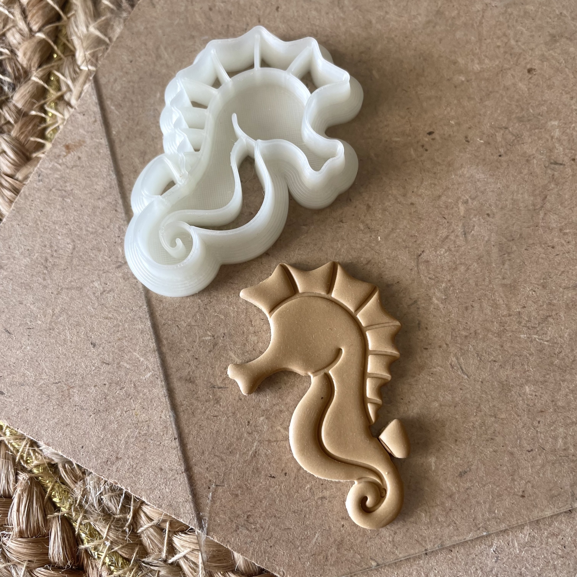 • cortador de massa branco em formato de cavalo-marinho com peça de massa dourada moldada igual