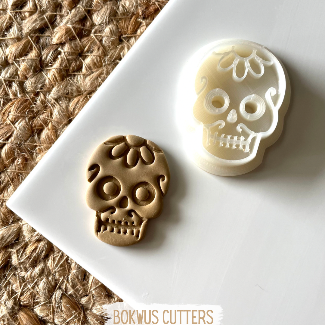 • Cortador de biscoitos em forma de caveira junto com massa moldada e a inscrição BOKWUS CUTTERS