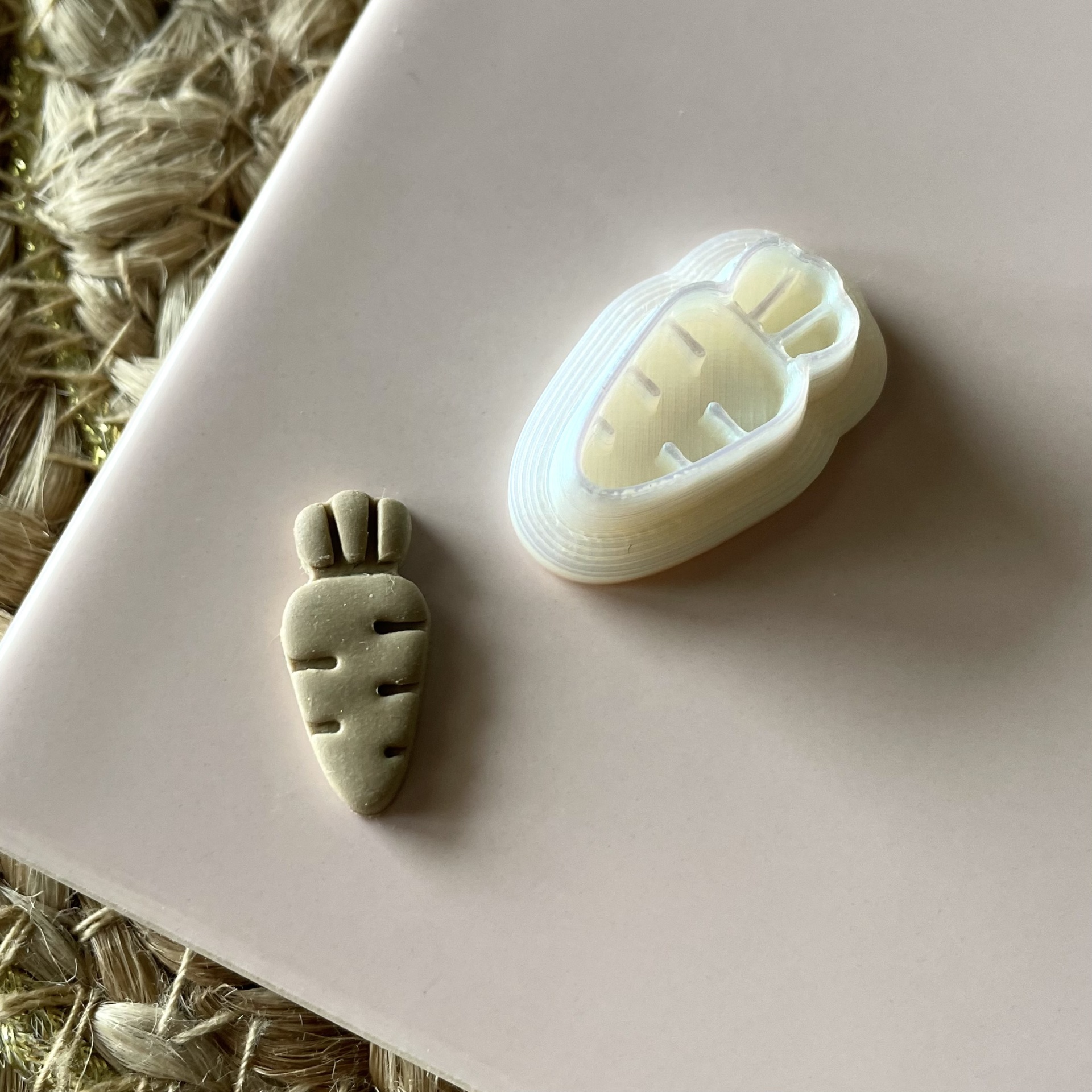 • Botão em forma de cenoura transparente com relevo numa superfície cinzenta