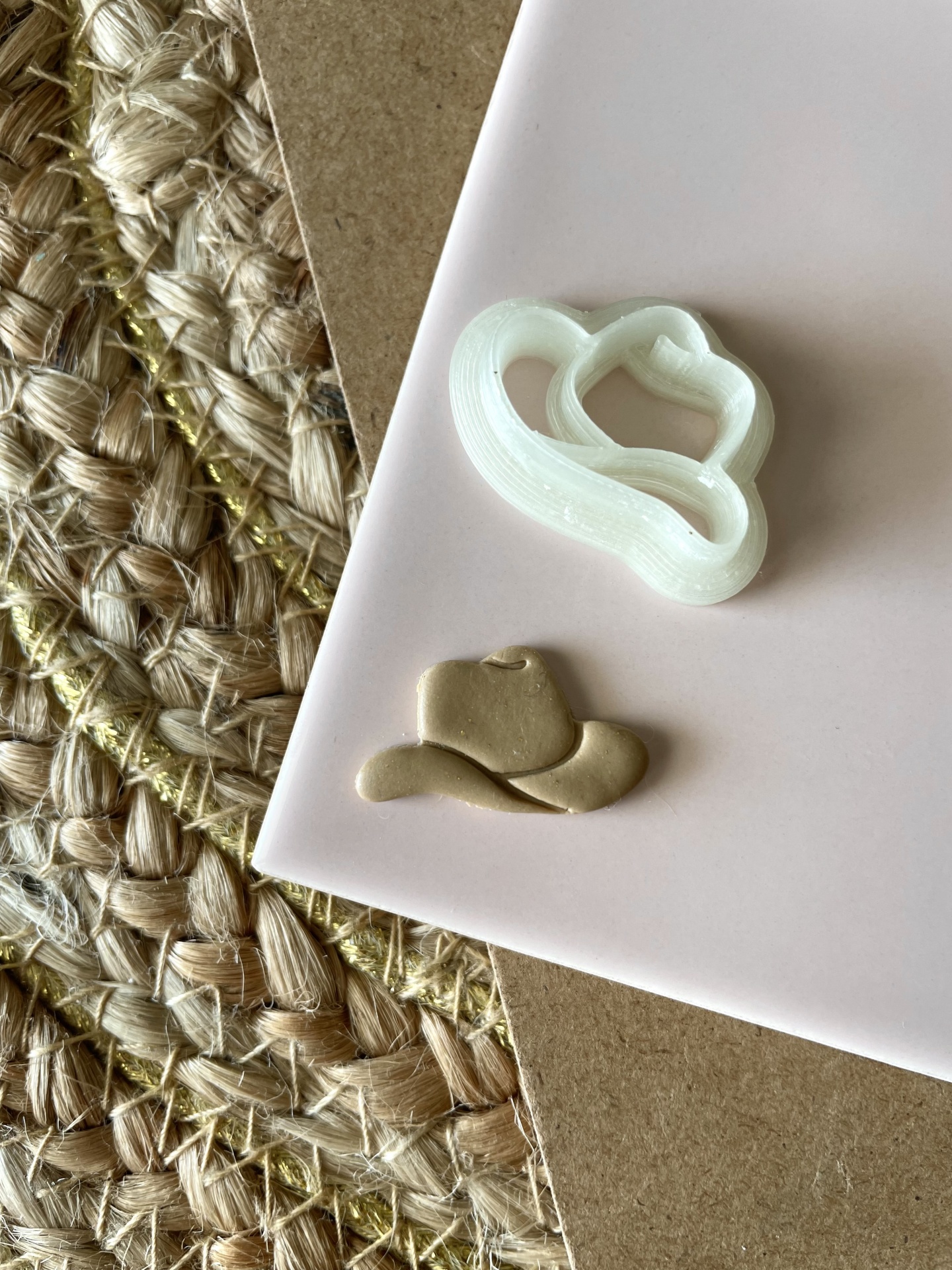 • Carimbo e peça em forma de chapéu de cowboy sobre superfície rosa clara e fundo texturado