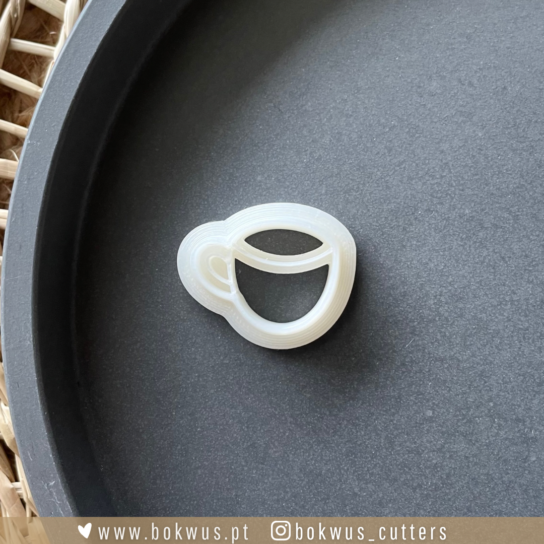 • Cortador de bolachas forma de chávena de café em plástico branco sobre superfície preta circular
