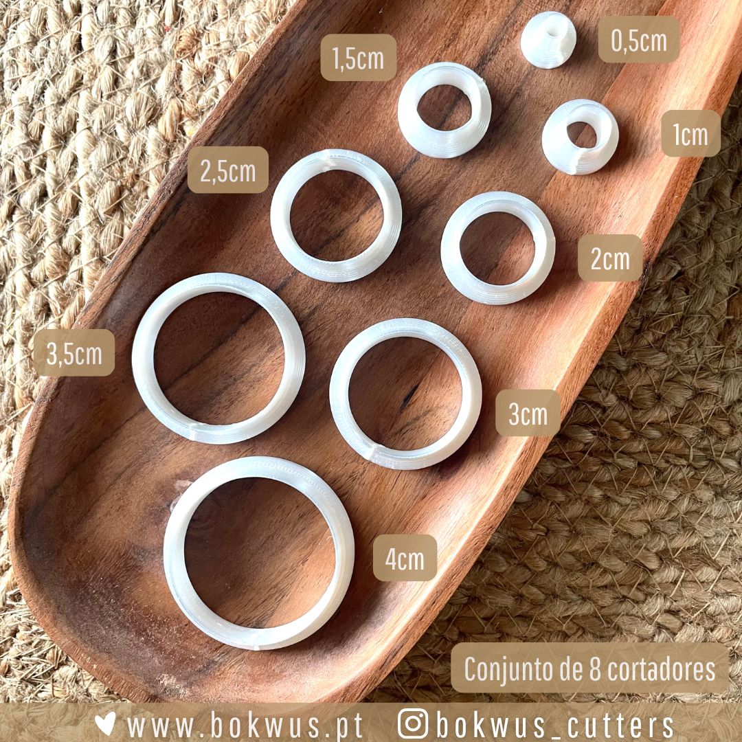O conjunto de 8 cortadores inclui os seguintes diâmetros: