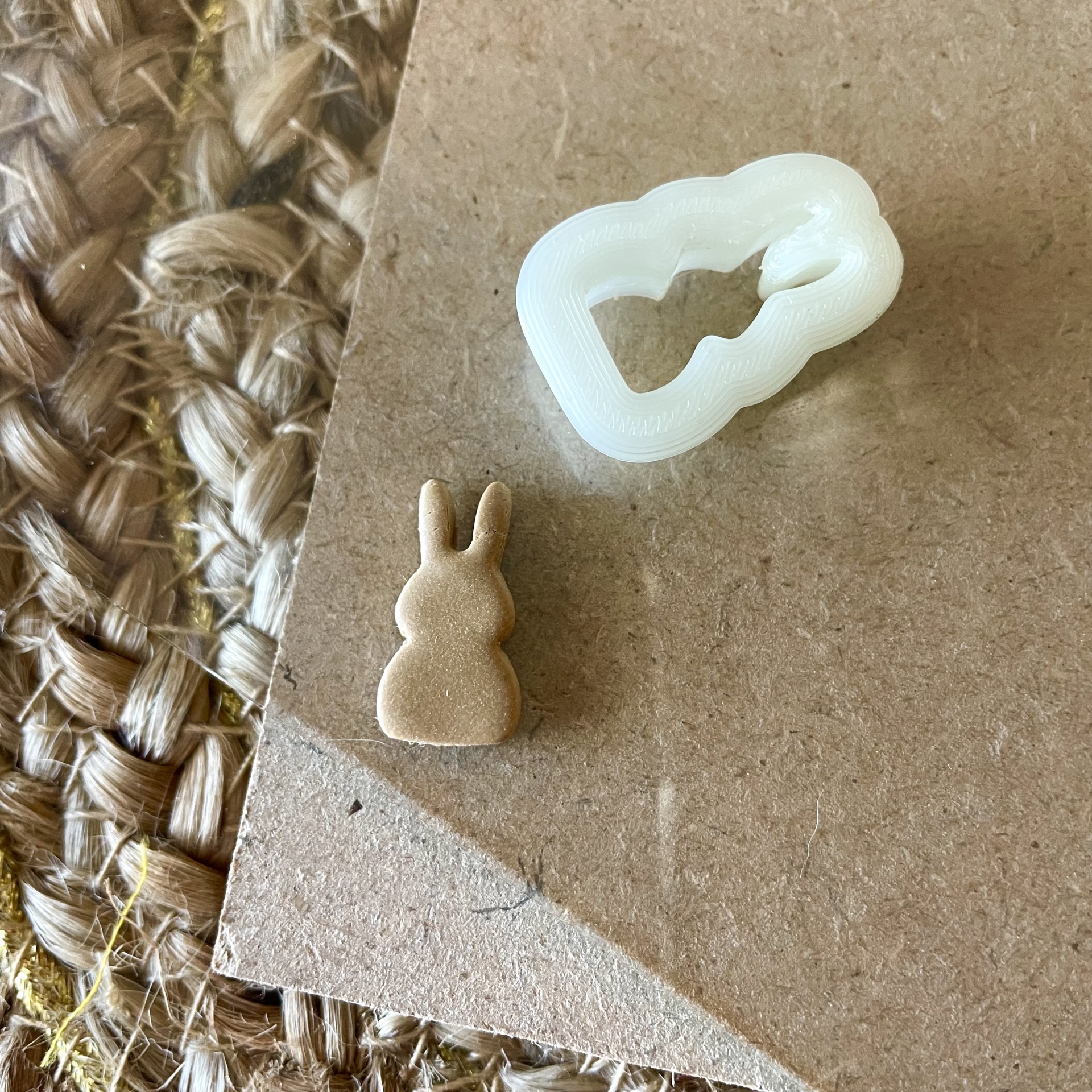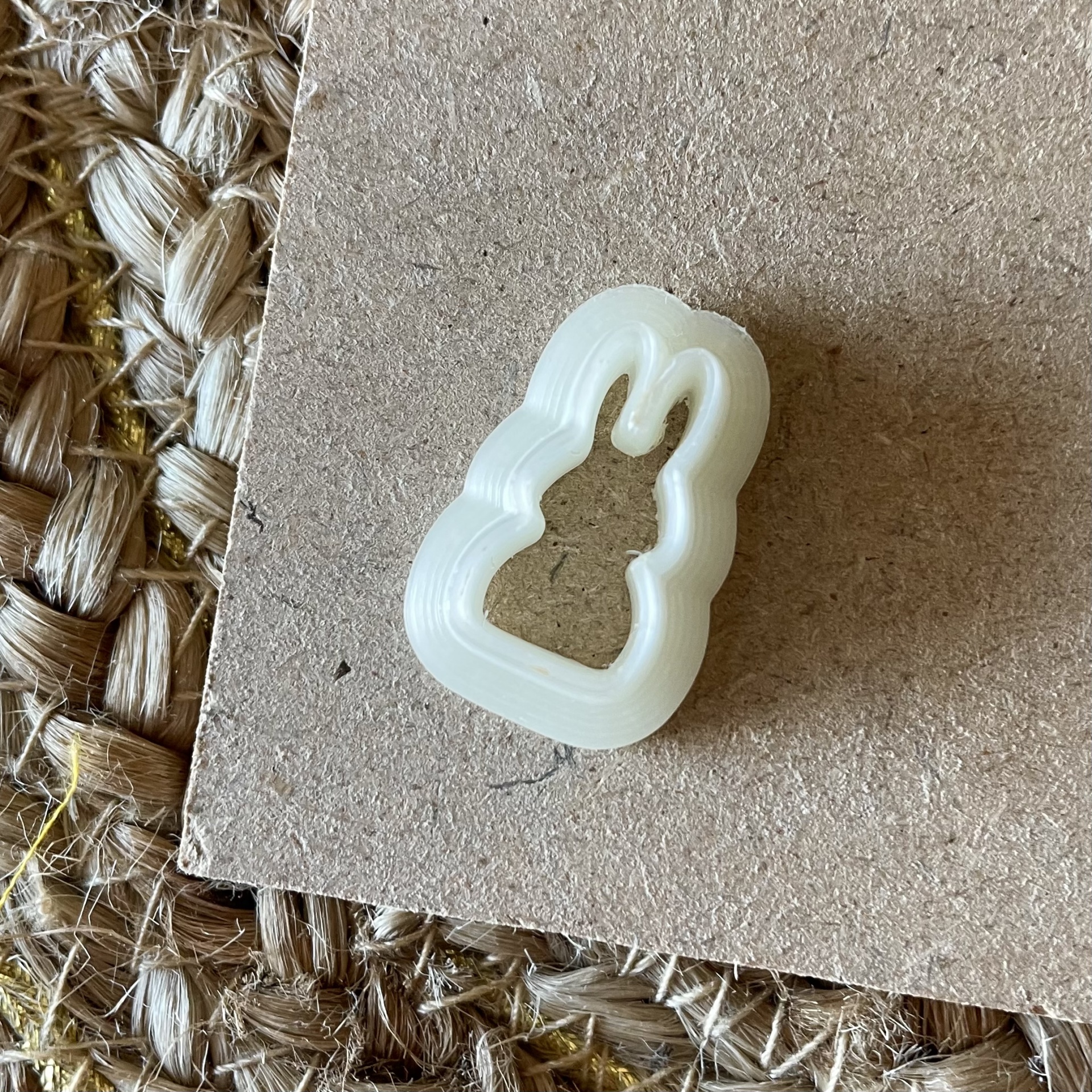 • Cortador de biscoitos em forma de coelho, plástico translúcido, sobre madeira e tapete trançado.