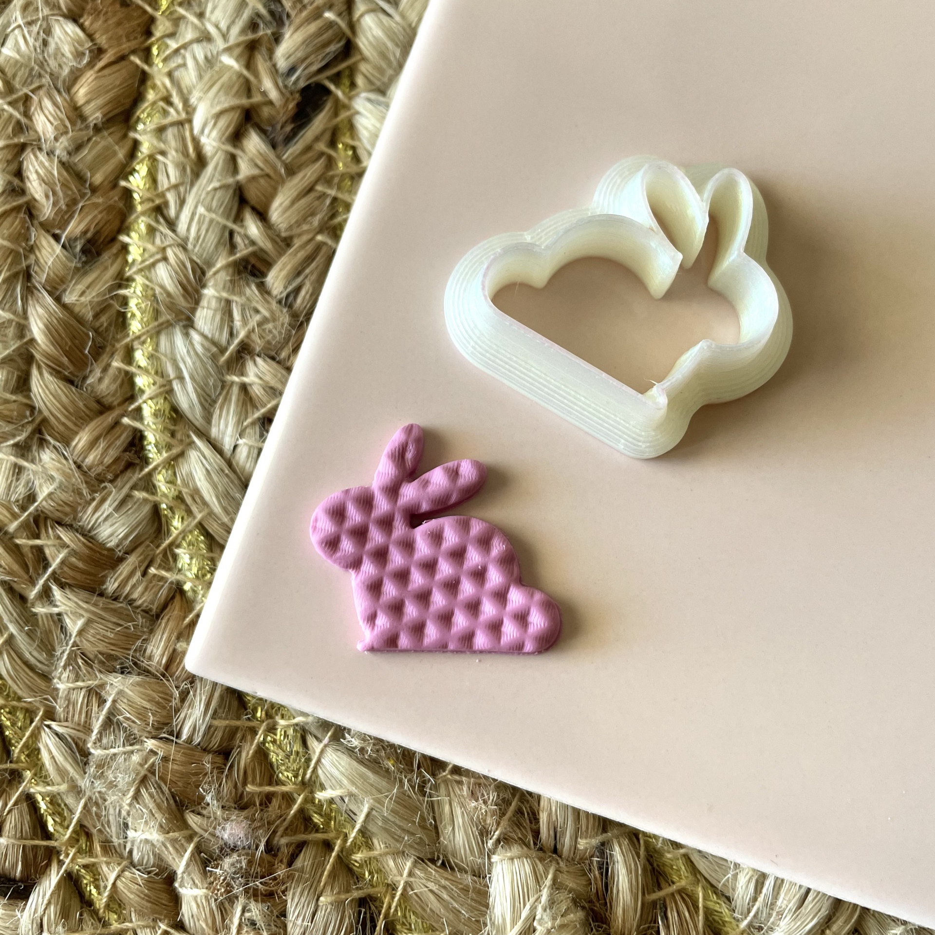 • Molde cortador e peça em forma de coelho sobre superfície rosa e tapete de fibra.