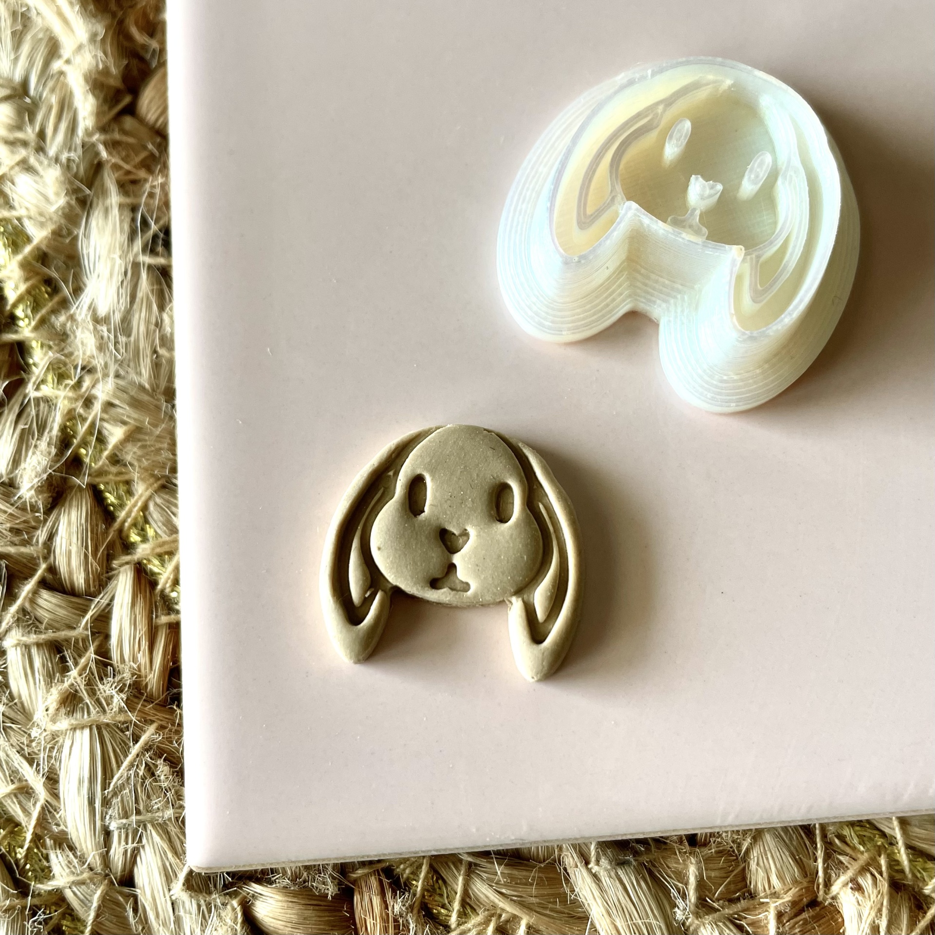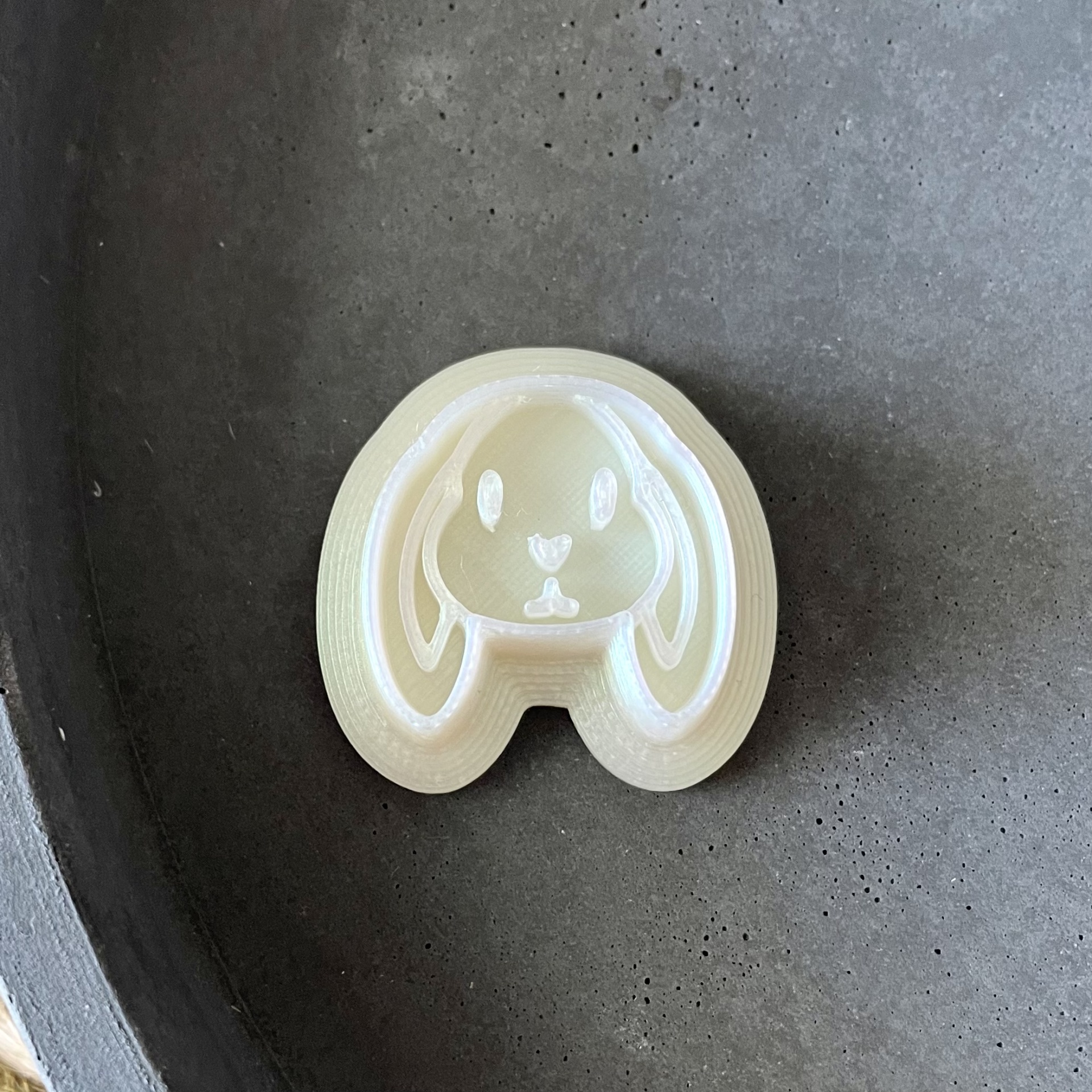 • Cortador de biscoitos branco formato cabeça de coelho com biscoito bege ao lado sobre fundo rosa e tapete de fibras