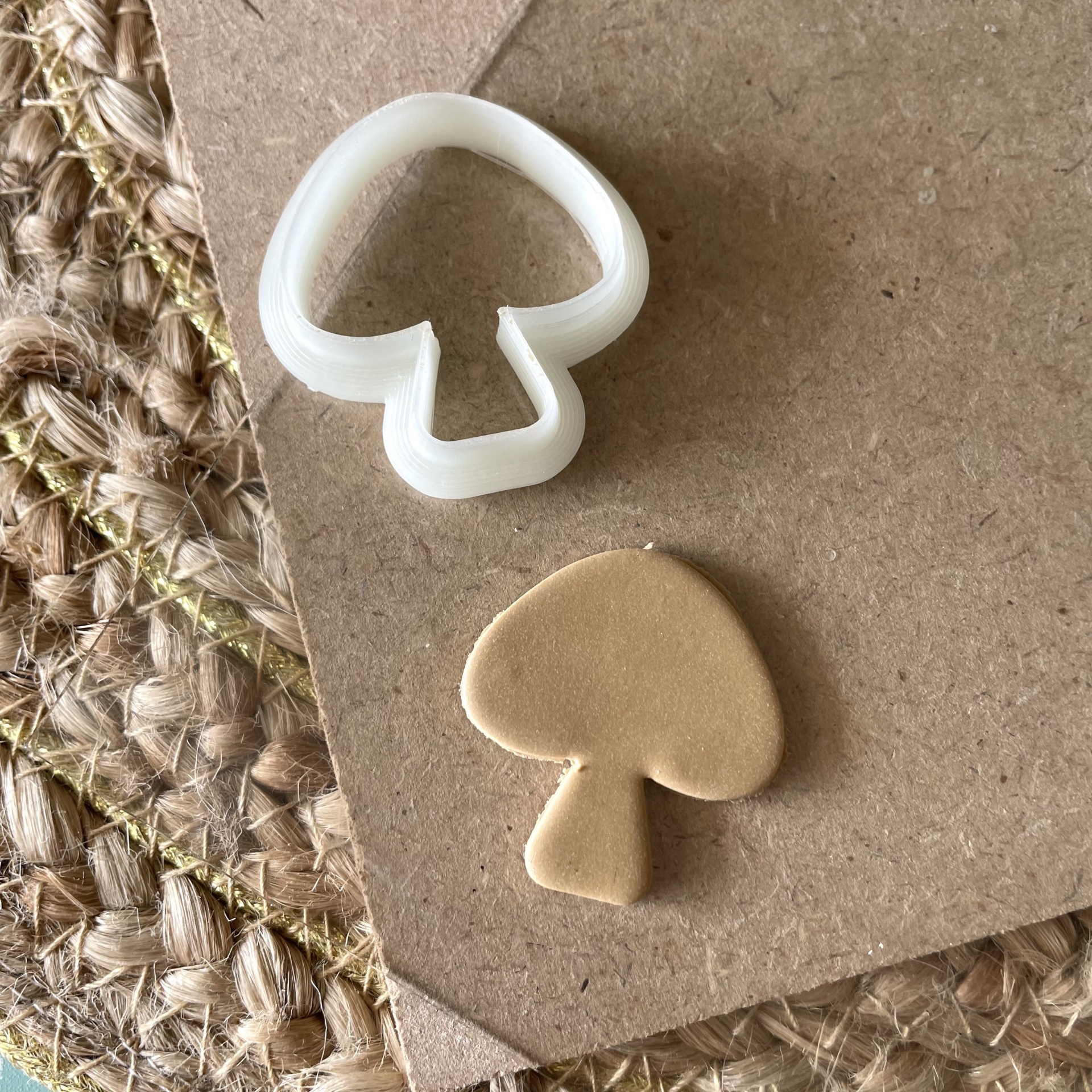 Cortador branco em forma de cogumelo e biscoito moldado na mesma forma sobre papel castanho e tapete de corda.