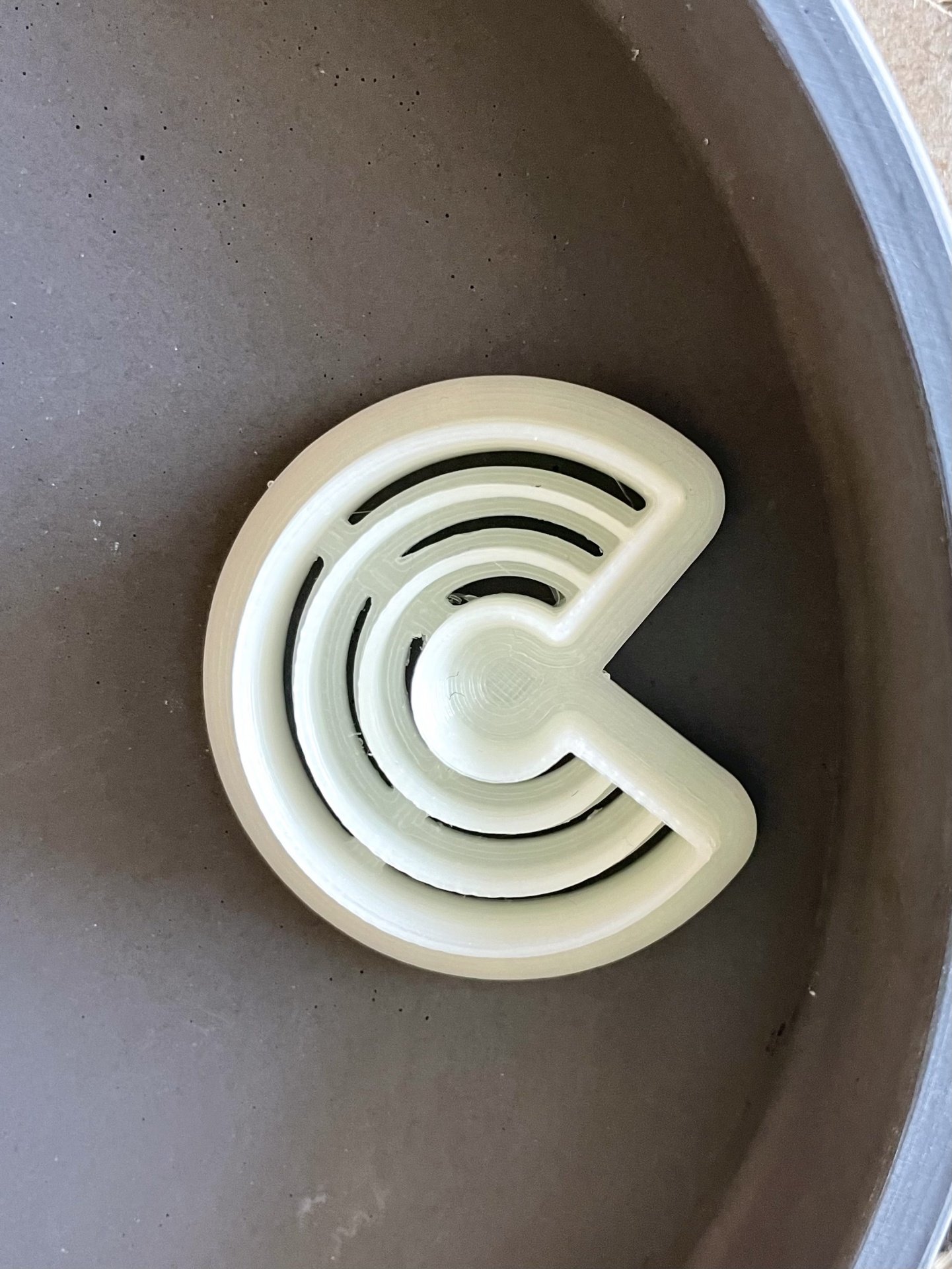 Dispositivo branco de plástico circular com cortes triangulares na superfície cinza