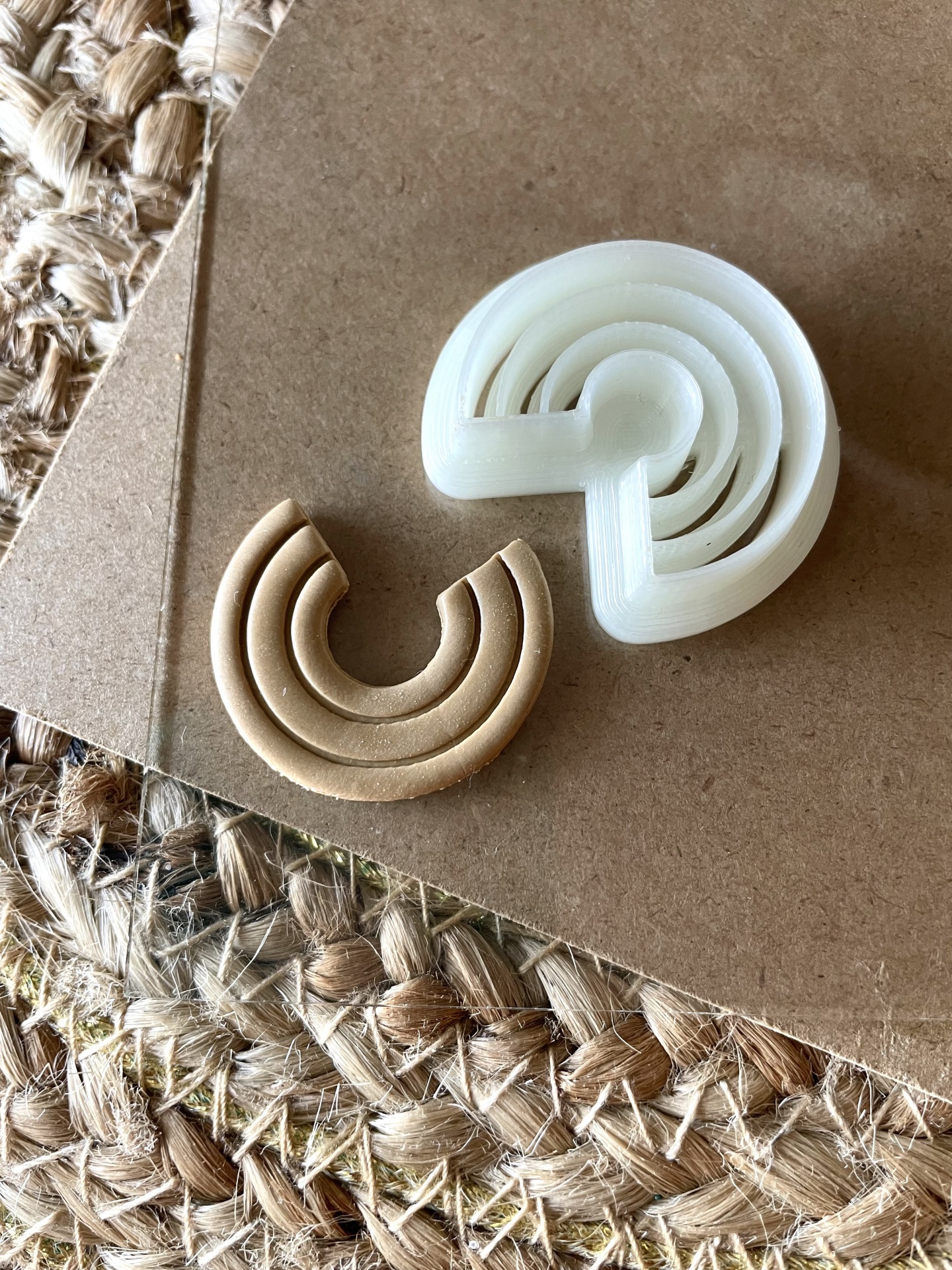 • Dois conjuntos de aneis em forma de arquinho, um branco e outro castanho claro, sobre papel castanho e superfície de fibras naturais