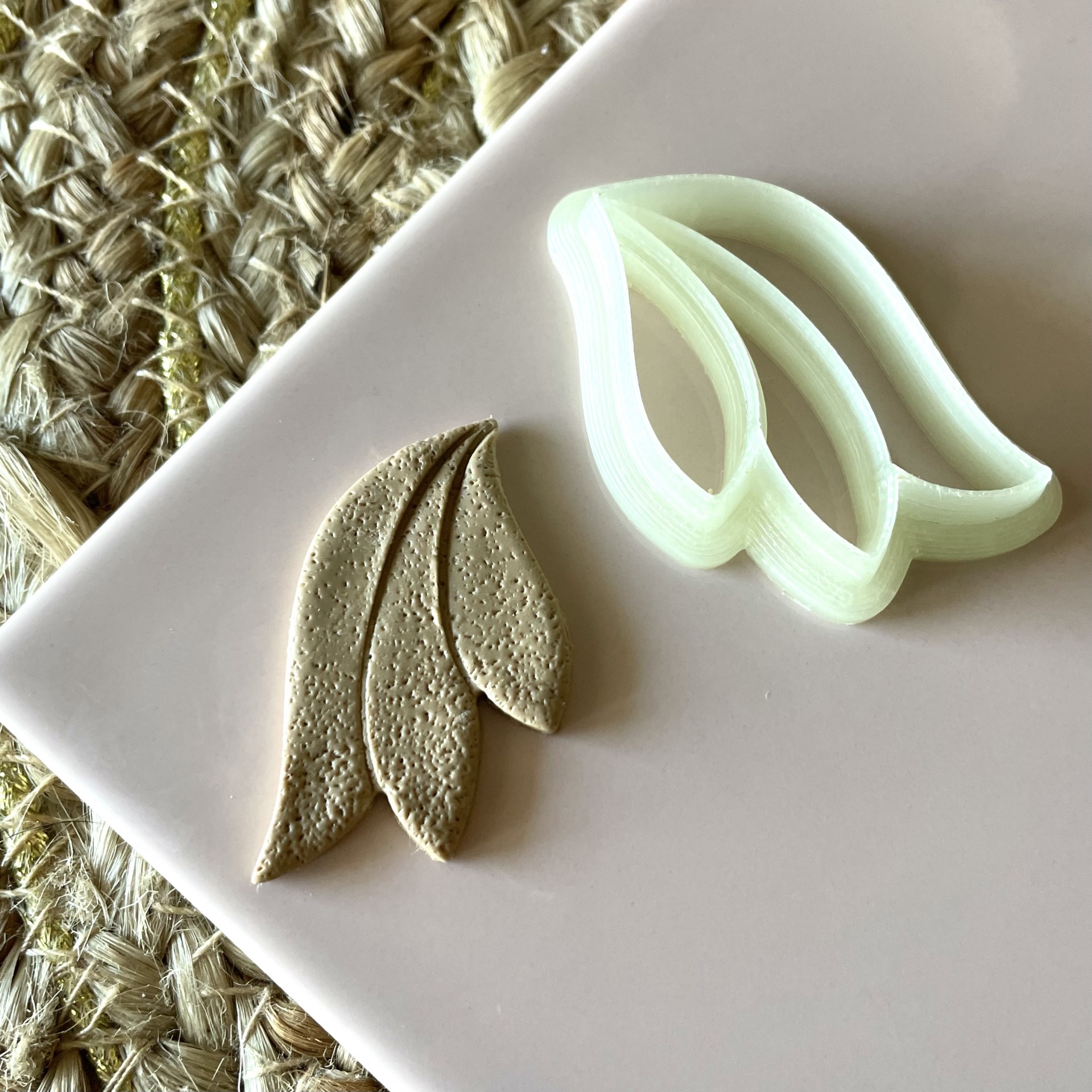 • Molde plástico branco em forma de folhas com peça de argila castanha texturizada ao lado, sobre prato rosa e tecido rústico.