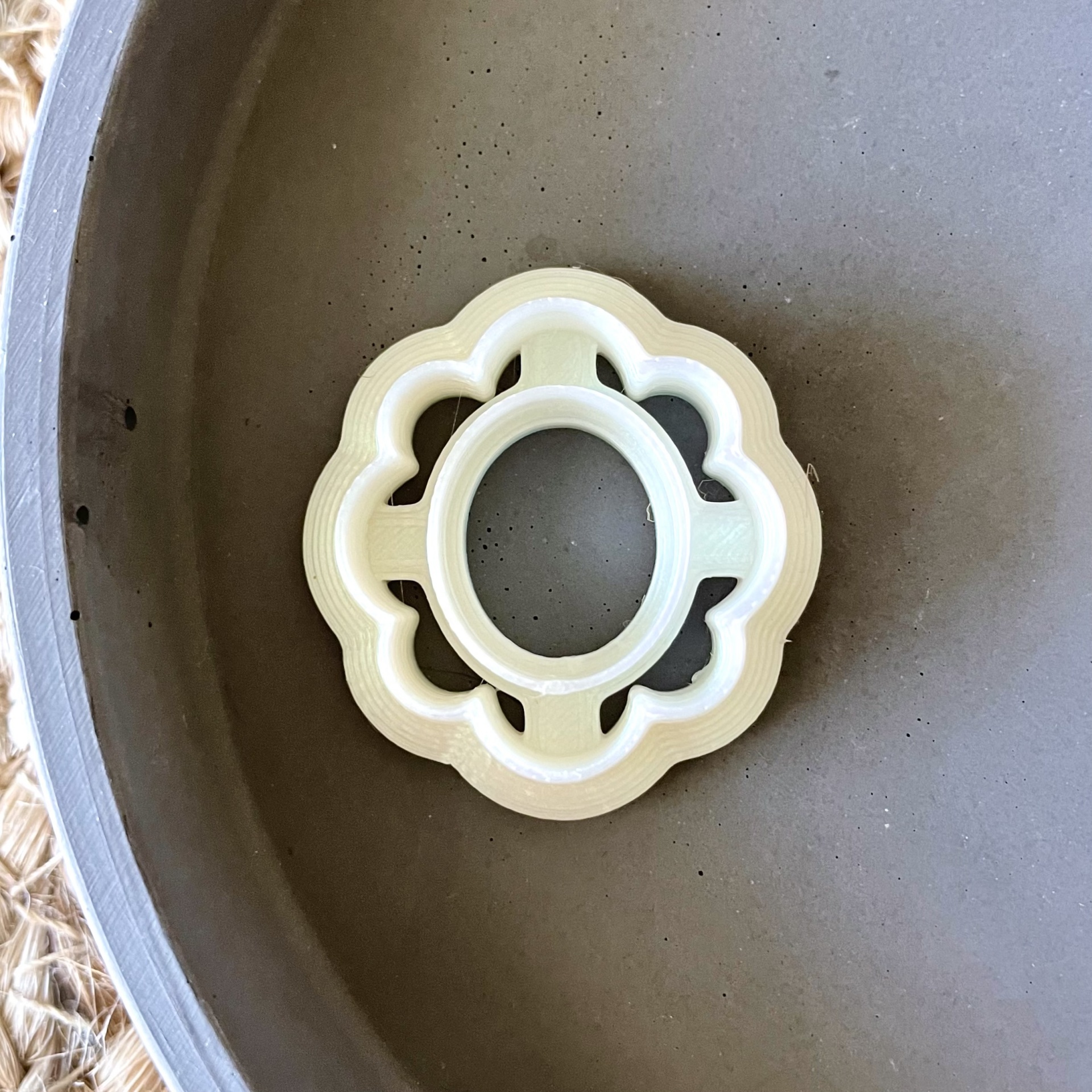 Cortador de biscoitos branco em forma de flor com biscoito em cima de base cor de rosa e ráfia ao lado.