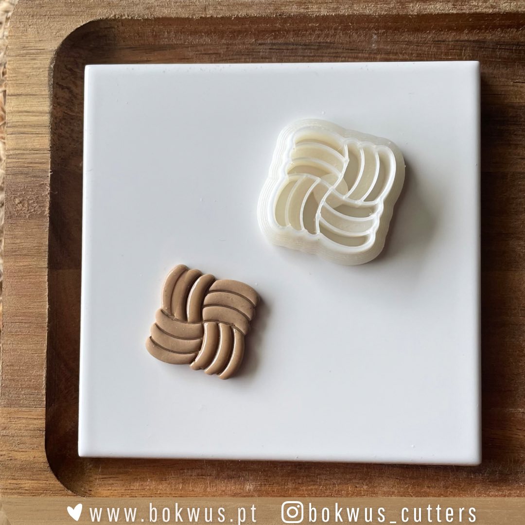 • Dois cortadores de massa entrelaçados, branco e marrom claro, sobre placa branca e bandeja de madeira.