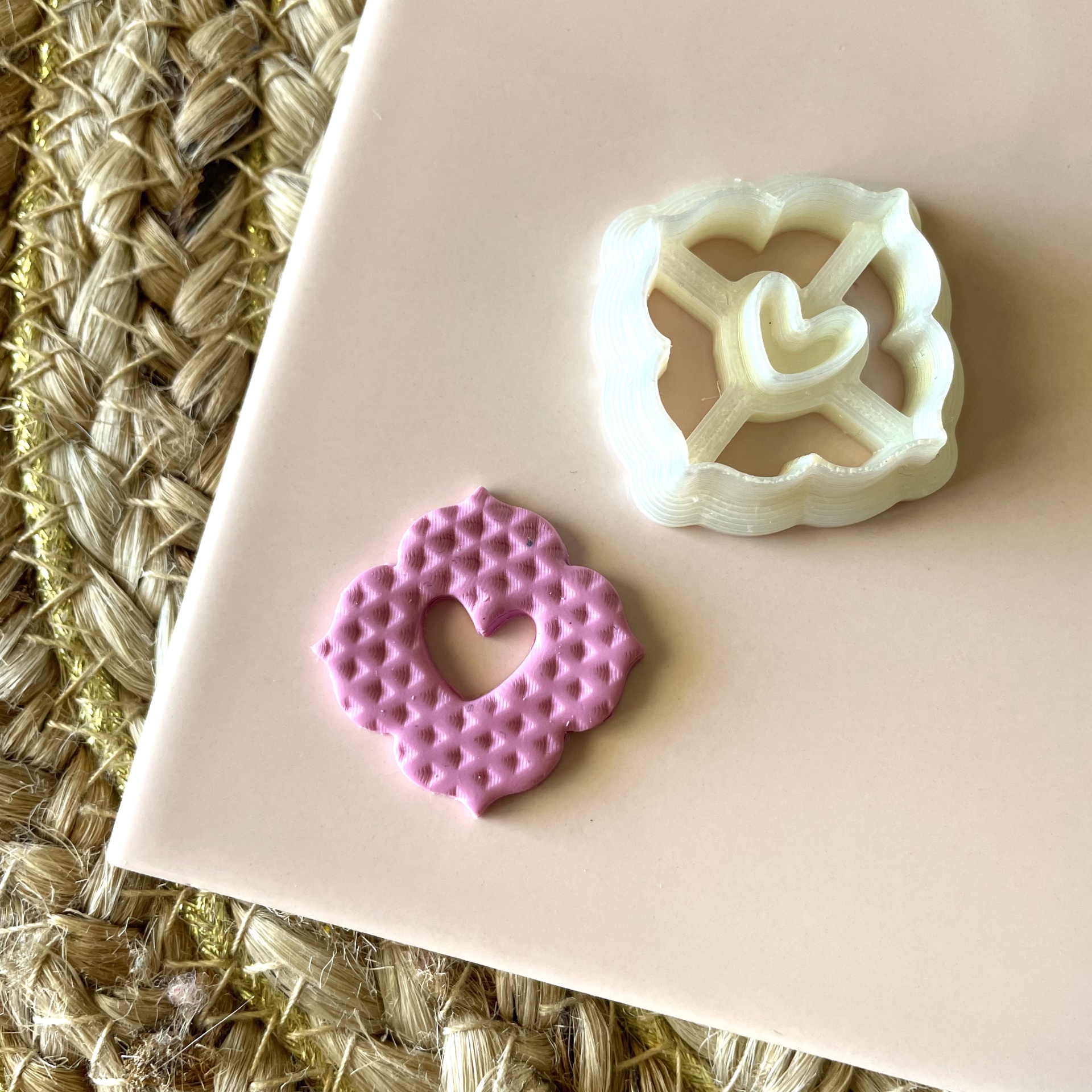 • Carimbo branco de plástico e padrão rosa com coração em relevo sobre superfície rosa clara