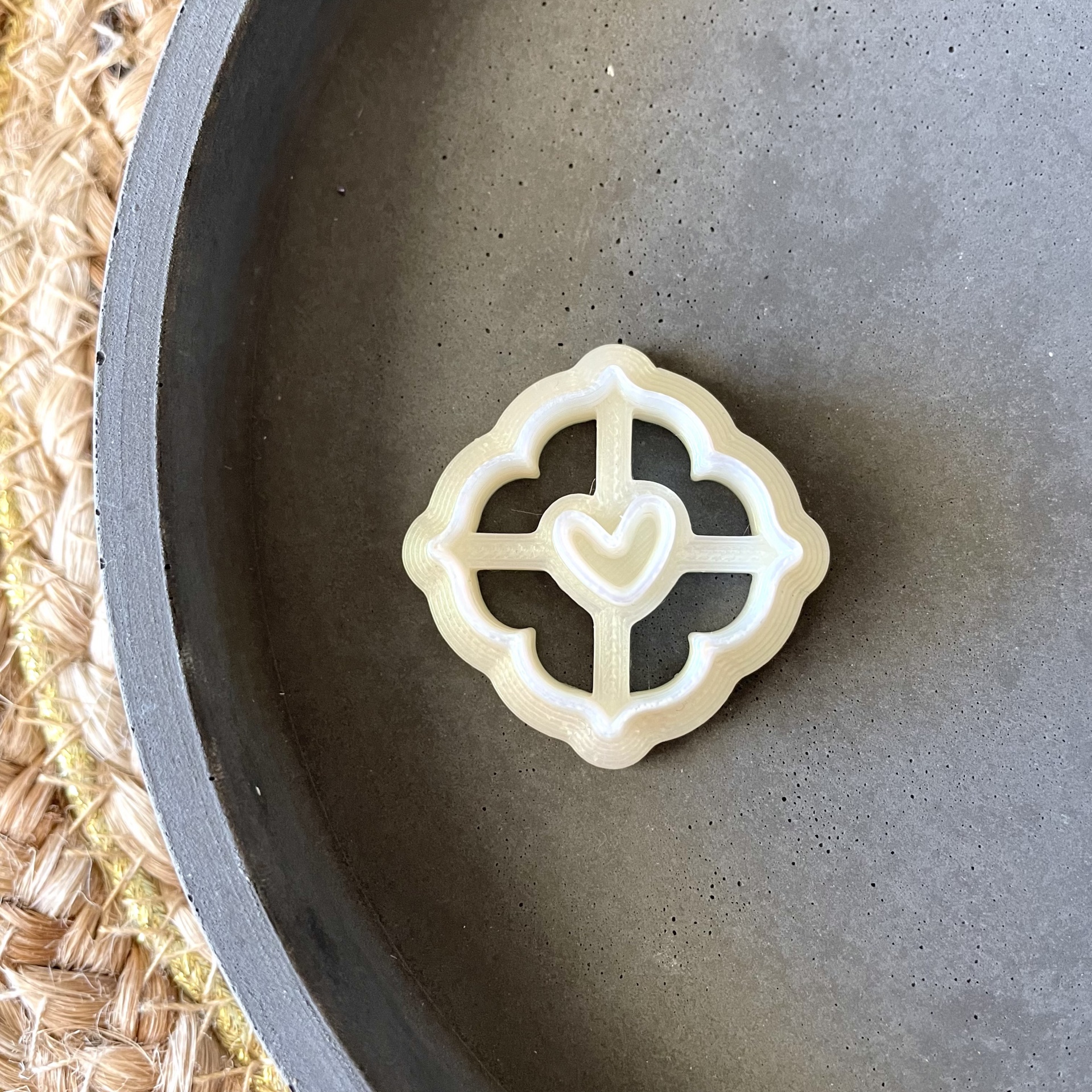 Selo plástico branco translúcido com desenho de coração no centro, sobre prato cinza e tapete de palha