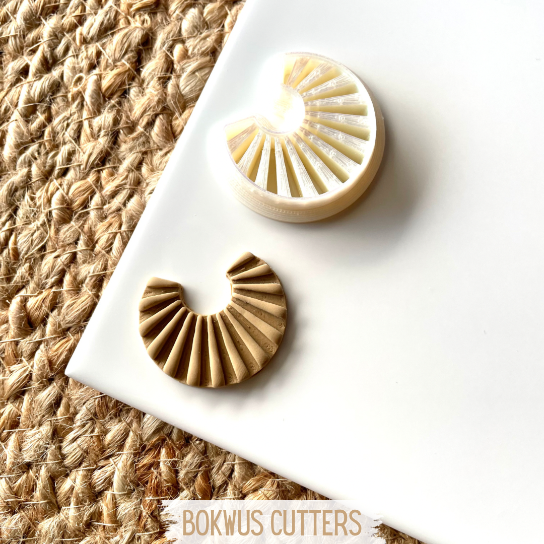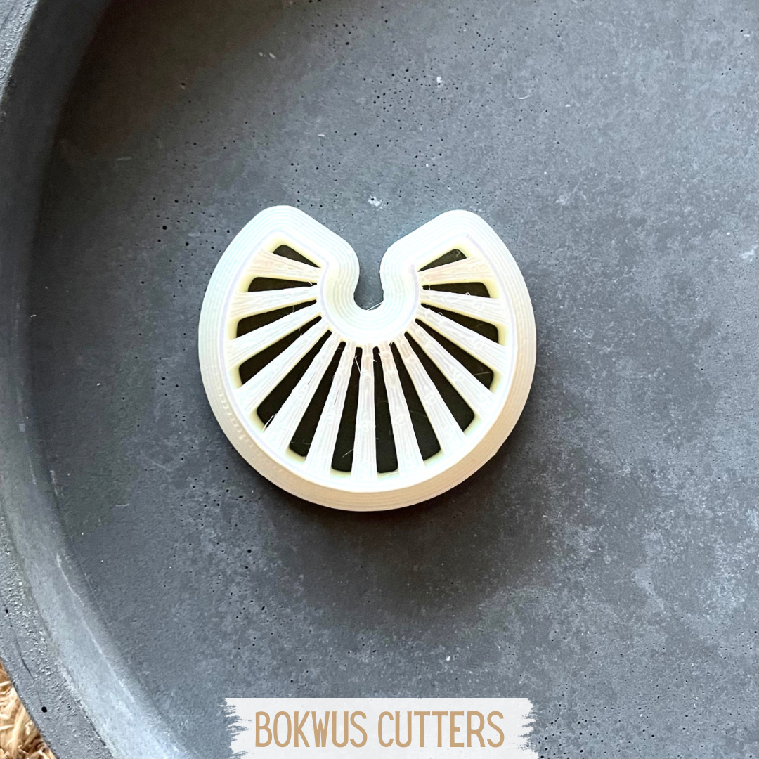 • Cortadores semicirculares BOKWUS CUTTERS em tons bege e dourado sobre superfície branca e tapete de fibras naturais.