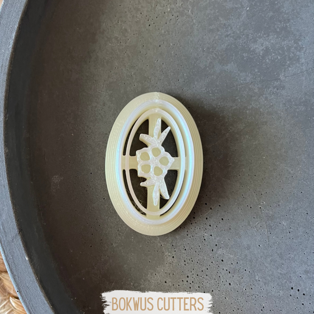 • Dois moldes de bolachas ovais com design floral em superfície rosa e tapete de palha
