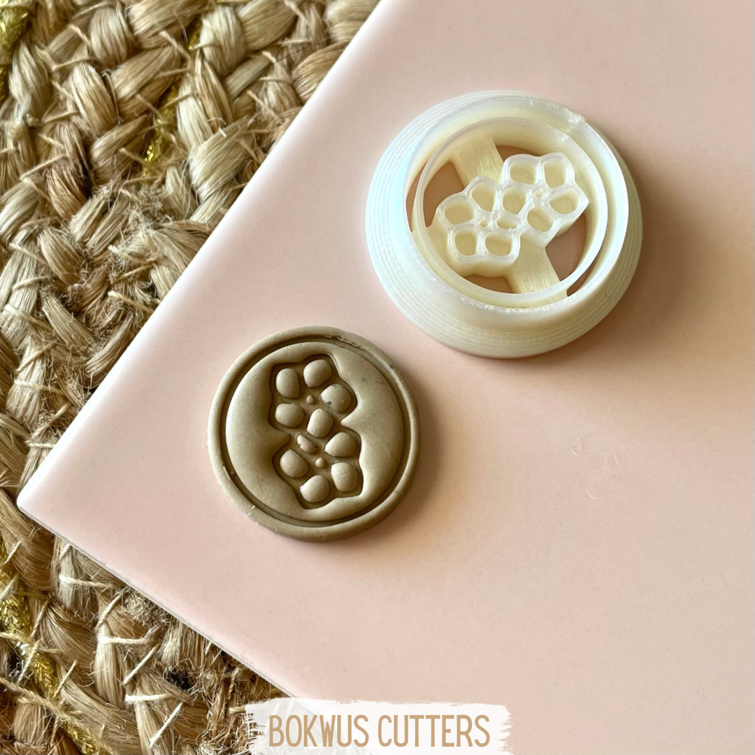 • Cortante de silicone e impressão de cera com motivo de ninho de abelha sobre base rosa e juta