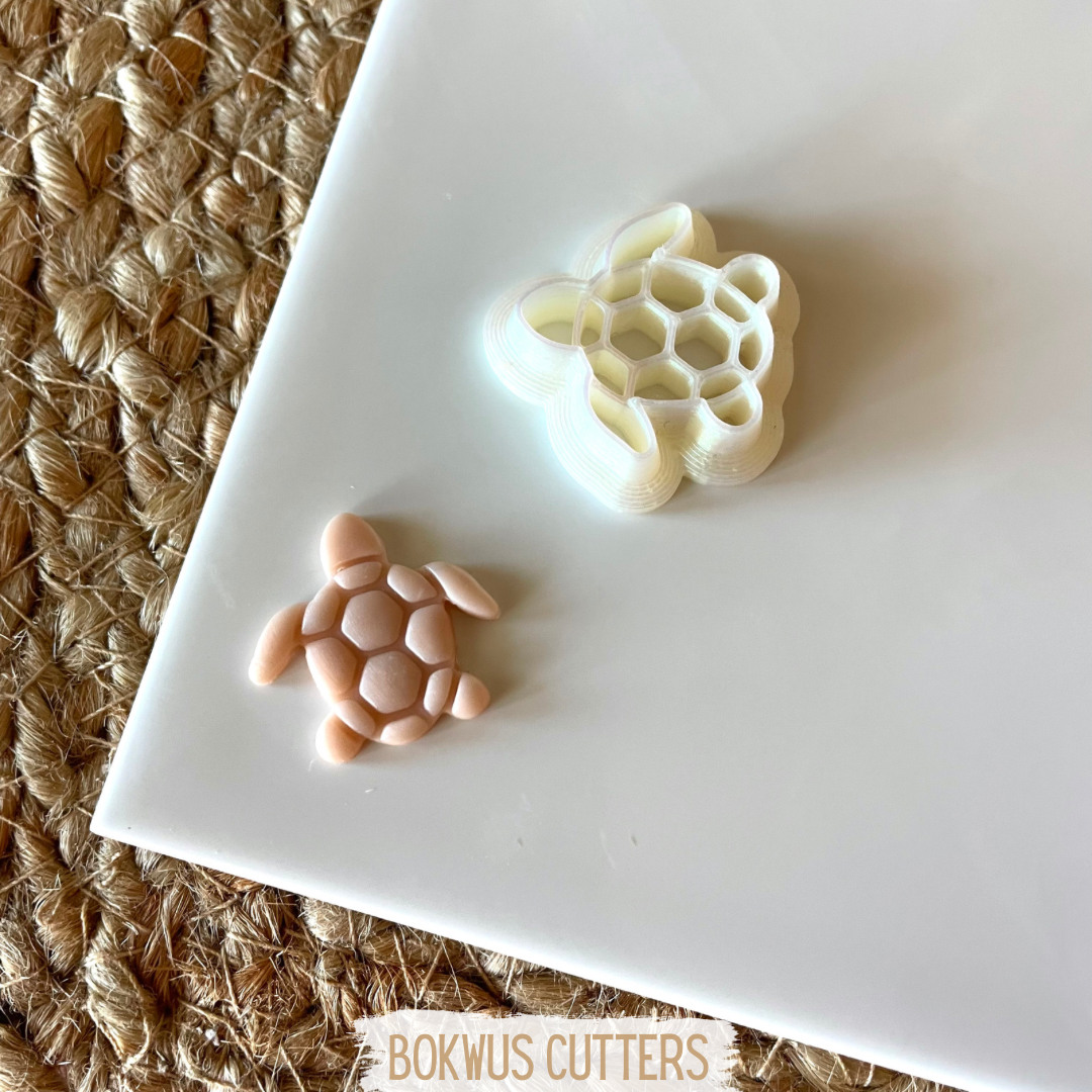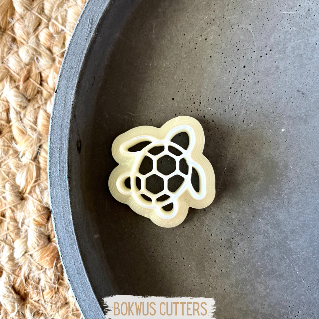 • Cortador de massa em forma de tartaruga e peça decorativa sobre superfície branca com fundo de tapete rústico