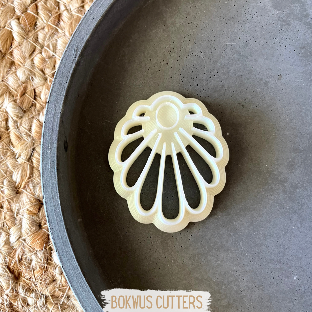 Cortador de bolachas em forma de concha branco em prato cinzento sobre fundo de juta