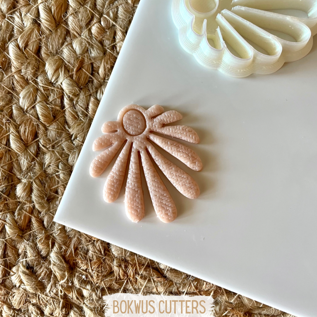 • Cortador de biscoitos em forma de flor com molde rosa texturizado sobre superfície branca e tapete de fibras