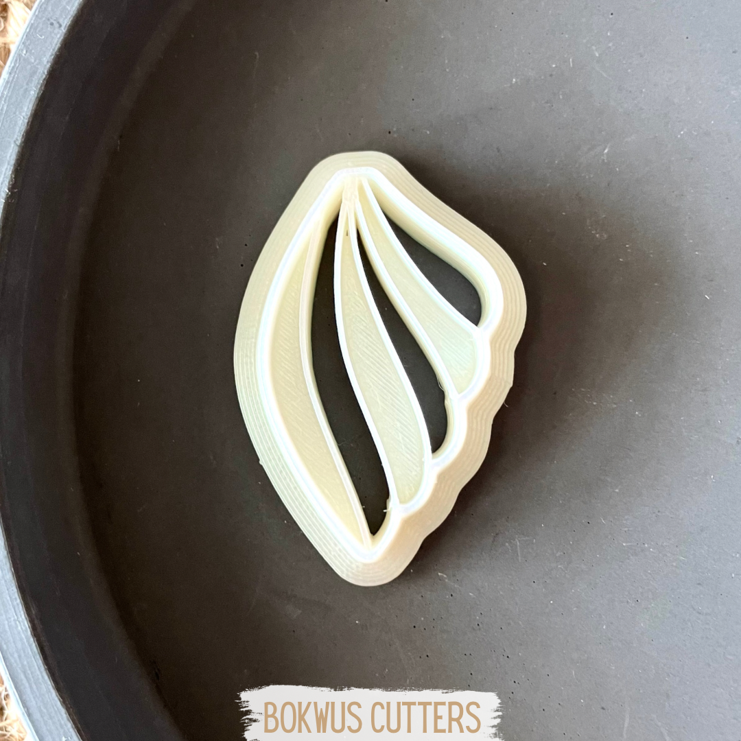 • Cortador de fondant branco em forma de folha ondulada com peça de massa bege com manchas sobre superfície branca e tapete de fibra natural.
