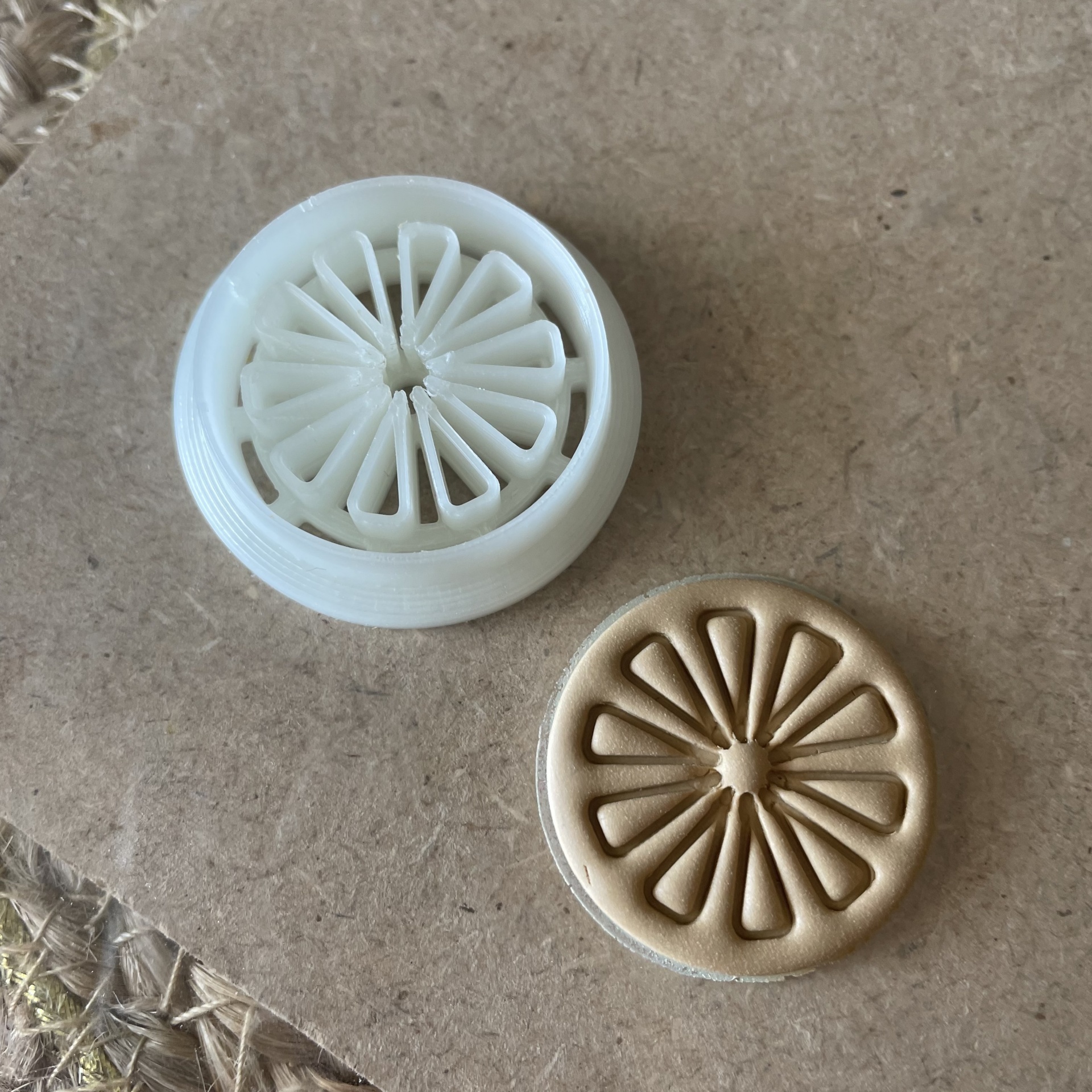 • Carimbo branco redondo com padrão floral e impressão em argila bege