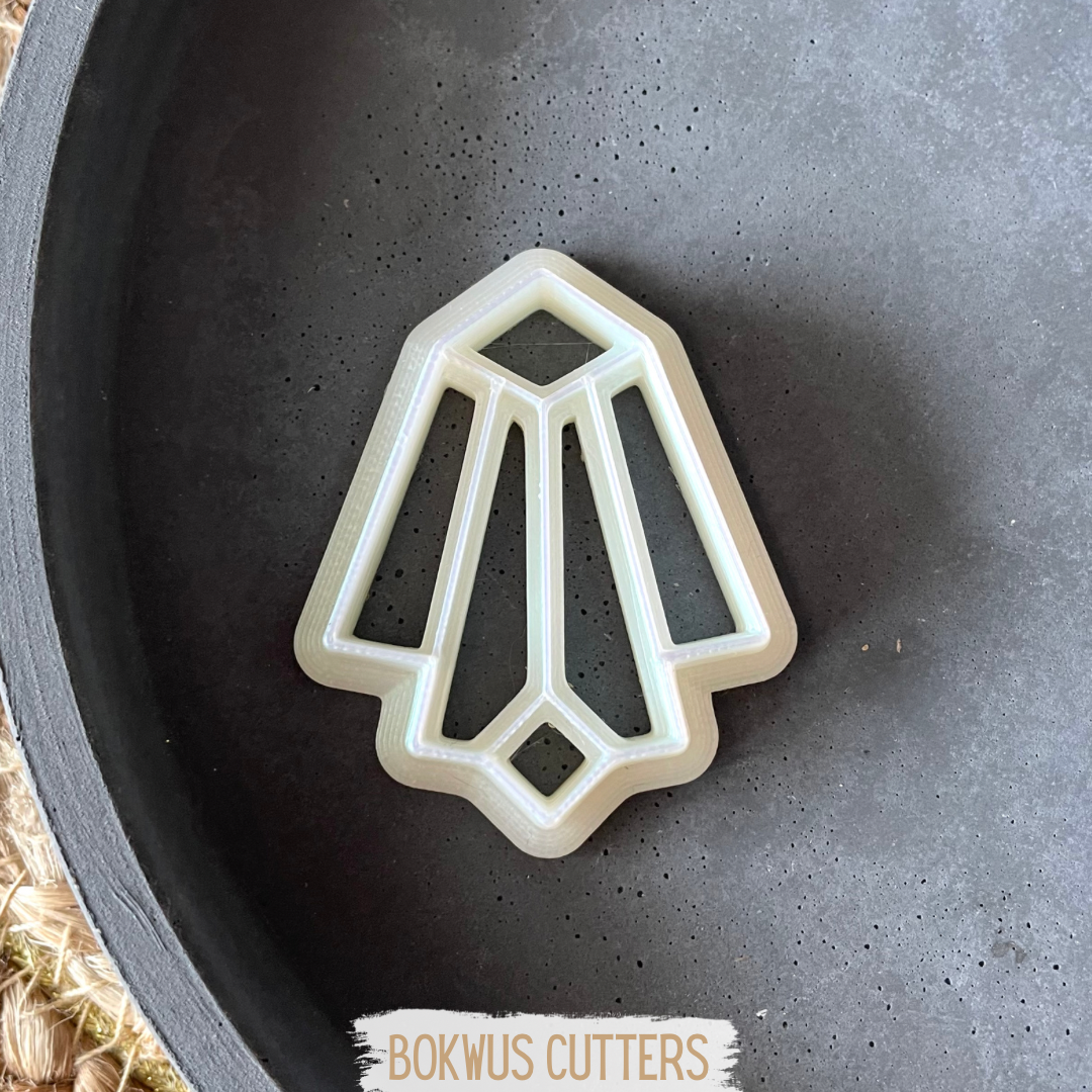 Cortador de bolachas branco com forma geométrica numa superfície cinzenta