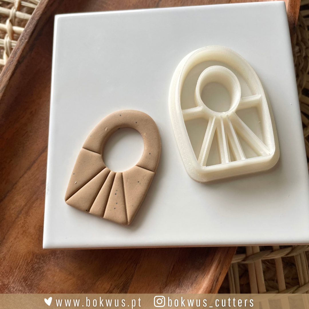 • Cortador plástico branco e peça de argila bege com padrão geométrico sobre superfície branca em tabuleiro de madeira